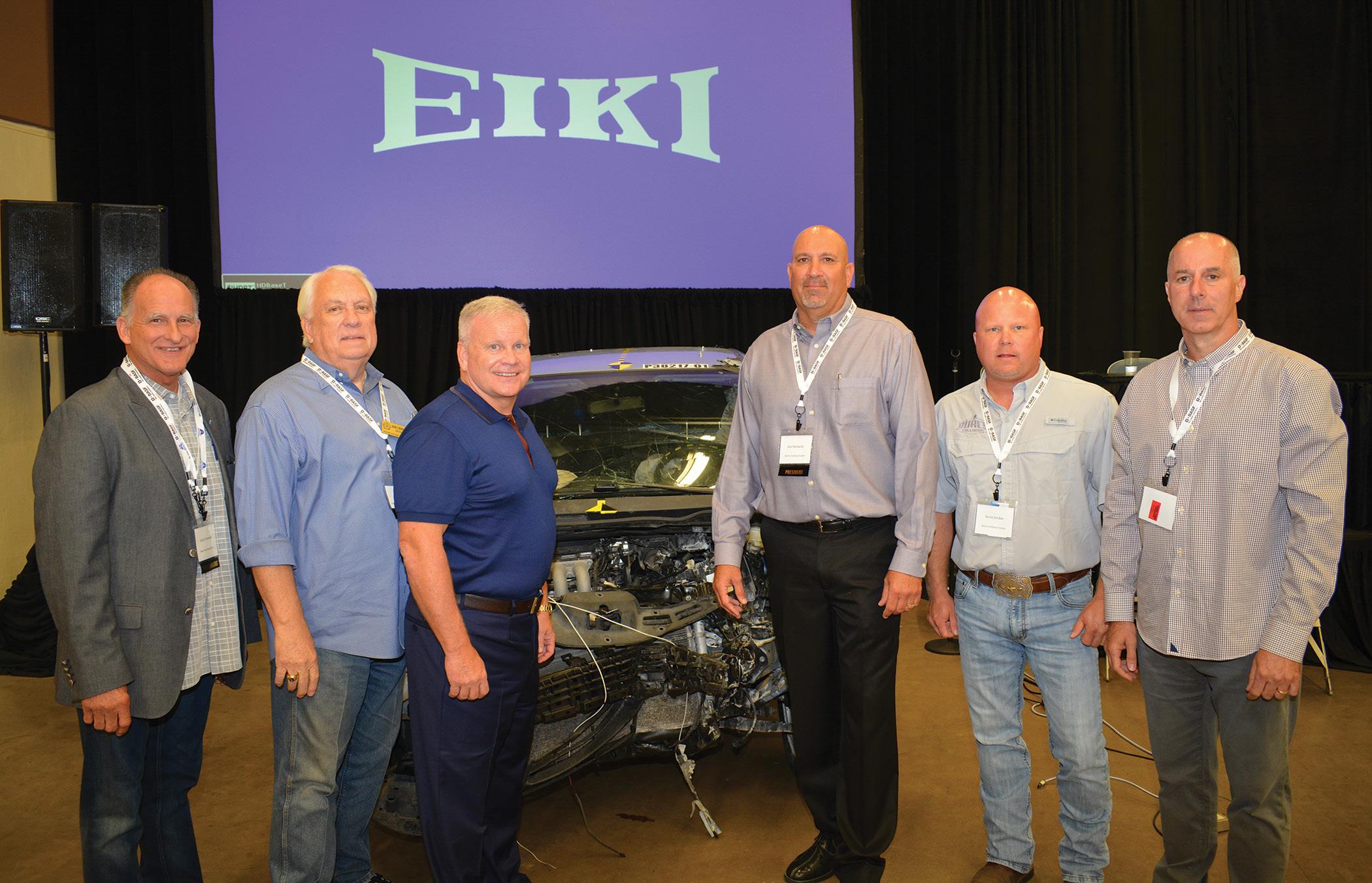 Crash-tested 2010 Honda Fit repaired with OEM parts and procedures with (l-r) Larry Cernosek (Deer Park Auto Body; Pasadena), John Kopriva (Kopriva Body Works; Houston), Todd Tracy (Tracy Law Firm), Burl Richards, Donald “Trip” Springer (Burl’s Collision Center; Henderson) and Jerry McNee (Ultimate Collision Repair; Edison, NJ).