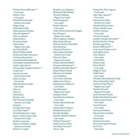 Nicolas Francis Jablonsky*** Cum Laude Danilo V. Jara Cum Laude Randall Pearson Jenks Summa Cum Laude Xingyu Jiang Akash Kumar Jilla Valerie Jimenez-Soriano Jethro Jn-Baptiste** Alicia A. Johnson Hope Johnson Stevenley Joseph Upasna Kaur Magna Cum Laude Aya Sayed Khalil Robert William Khela Richmond Arthur Koomson Christina Maria Korol Amanda Nicole Kulikowski Christopher Joseph Kurtanick Taylor Leigh Kutzin* Dianamagne Zaragoza Laborce** Cyndi Lam** Ana Karen Lania Summa Cum Laude Justice Lawless Cum Laude Erika Danielle Leonida Cum Laude Xueyu Li Yuhan Li Zhuoying Li Shashi J. Lilia John Thomas Litchfield Summa Cum Laude Deng Liu Gineyda Yeya Lopez Lucy Eliza Lopez** Massiel Emperatriz Lopez Jessica Victoria Lopez Calle Summa Cum Laude Barbara Lorenzana Riyamira Zulaybar Lugada Summa Cum Laude Dimitri V. Luzgin*