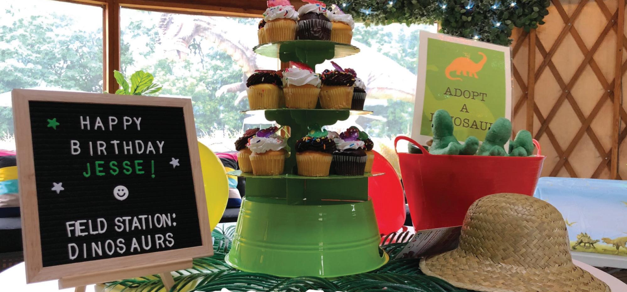 Our fossil dig party was originally supposed to be in our backyard, but we had to move it due to a rain forecast. The Tenafly Nature Center was an ideal backup plan as they have a huge, covered outdoor space that was the perfect setting for our prehistoric party. We provided the food and decorations and an outside vendor, Dinosaurs Rock (dinosaursrockprograms.com), provided the exhibits and fossil dig.