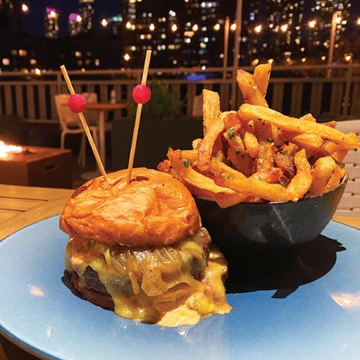 (Above) Chris Siversen’s Barnegat Sea Scallops is one of the most popular seafood offerings at The Feathered Fox in Livingston. (Inset) The famous David Burke Dry-Aged Cheeseburger is served at many of his restaurants throughout NJ.