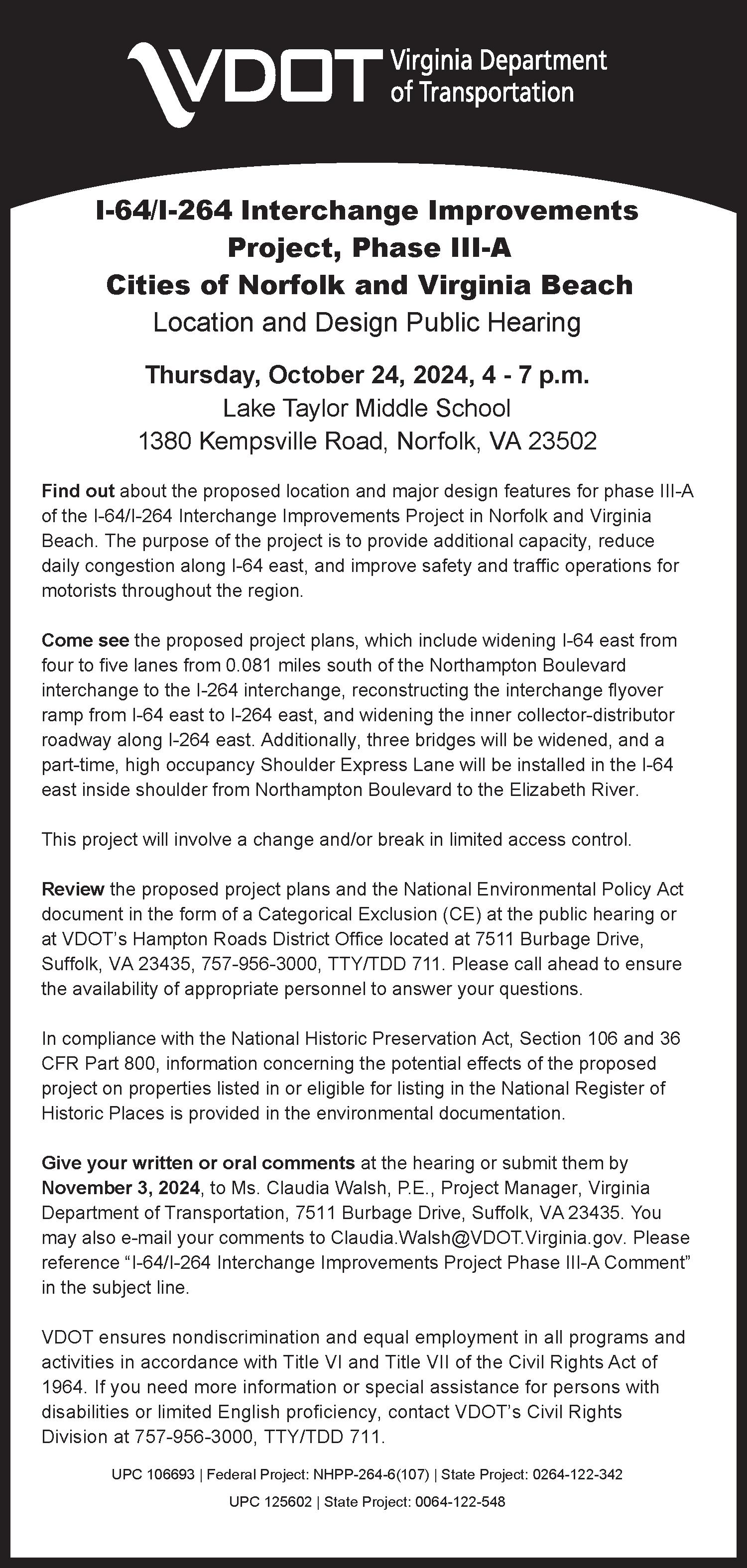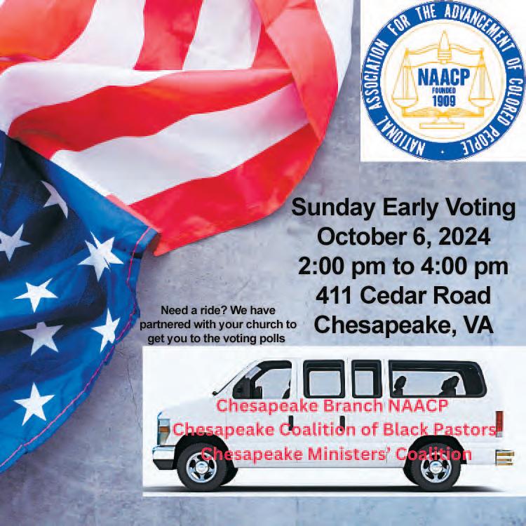 The Chesapeake Juneteenth Foundation is hosting a Candidates Forum on October 5 for city council and school board candidates running in Chesapeake. The forum will take place from 2 p.m. to 4 p.m. at the Buffalow Family and Community Center, 2403B Bainbridge Blvd., Chesapeake 23324. Call (757) 737-2180 for questions.