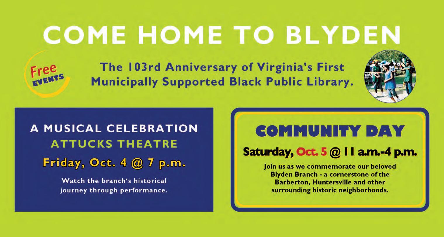 On October 4-5, the Norfolk Public Library will observe the 103rd anniversary of the historic Blyden Branch Library. “Come Home to Blyden” is its theme.