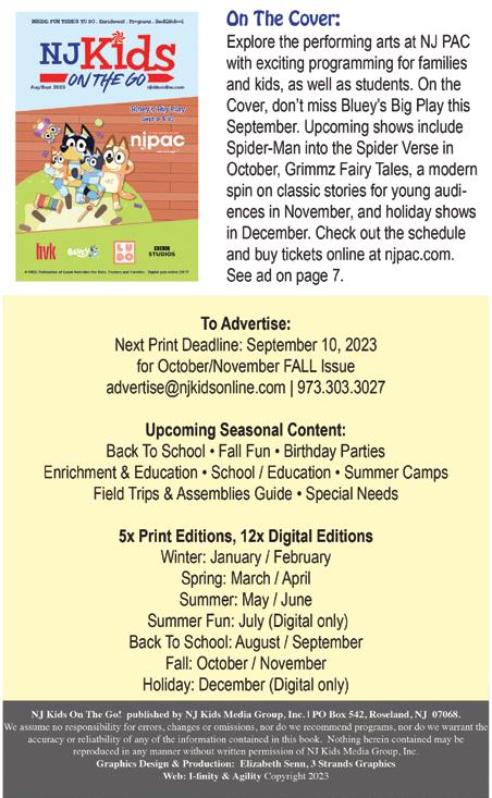 hvk A FREE Publication of Local Activities For Kids, Tweens and Families. Digital pub online 24/7! Aug/Sept 2023 njkidsonline.com INSIDE: FUN THINGS TO DO . Enrichment . Programs . Back2School see ad page 7 Bluey’s Big Play Sept 9 & 10