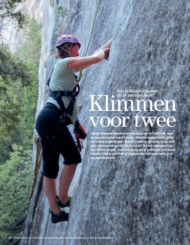 Klimmen voor twee Sytske Besemer woont sinds een paar jaar in Californië, waar ze naar hartenlust kan klimmen. Toen ze zwanger werd, wilde ze zo lang mogelijk door blijven klimmen, dus ging ze op zoek naar een speciale gordel die ze tot ver in haar zwangerschap kon blijven dragen. Haar conclusie: als je goed naar je lichaam luistert, hoef je echt niet te stoppen met klimmen zodra je in verwachting bent.