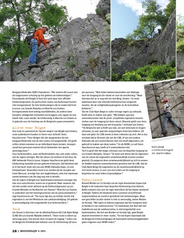 Bergsportfederatie (KBF) Vlaanderen. “Wij merken dit vooral aan de toegenomen scholing op het gebied van klettersteigen.” Desondanks telt België in heel het land maar drie officiële klettersteigroutes; de particuliere routes van buitensportcentra niet meegerekend. De drie klettersteigen zijn te vinden bij Pontà-Lesse, Les Grands Malades en Marche-Les-Dames. Eerstgenoemde kent weinig moeilijkheden, de andere twee bevatten uitdagende elementen als bruggen, een rappel en een death-ride. Leuk weetje: de klettersteig in Marche-Les-Dames is in gebruik voor de training van de Belgische paracommando’s.