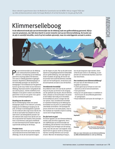 van de vingers en pols. Pijn op die plek wordt daarom al snel gediagnosticeerd en behandeld als een golferselleboog, met vaak tegenvallende resultaten als gevolg. De functie van de pronator teres wordt bij klimmers namelijk vaak over het hoofd gezien, terwijl deze juist de voornaamste oorzaak is voor de klachten.
