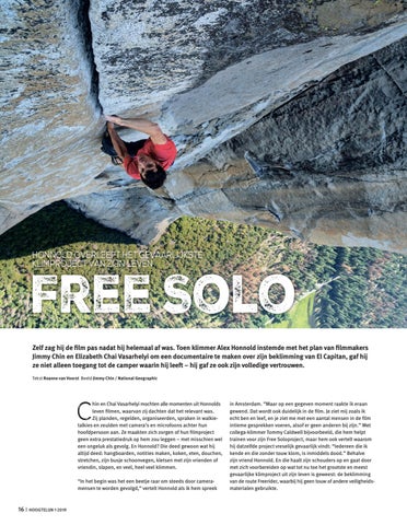 Free Solo Zelf zag hij de film pas nadat hij helemaal af was. Toen klimmer Alex Honnold instemde met het plan van filmmakers Jimmy Chin en Elizabeth Chai Vasarhelyi om een documentaire te maken over zijn beklimming van El Capitan, gaf hij ze niet alleen toegang tot de camper waarin hij leeft – hij gaf ze ook zijn volledige vertrouwen. Tekst Roanne van Voorst Beeld Jimmy Chin / National Geographic