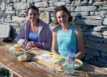 Als de zon hoog staat aan de felblauwe lucht, dwingt de warmte ons toch op pad te gaan. We krijgen broodjes, augurken en een grote paprika mee en dalen 1400 hoogtemeters af door het bos, over steen en rots. Als onze benen ervan beginnen te trillen pauzeren we even en maken ons laatste soepje. We passeren de geitenkaasboerderij die ons in de hut getipt werd en na even zoeken vinden we iemand die ons verse geitenkaas en kruidenroomkaas kan verkopen. Het pad blijft maar omlaag kronkelen