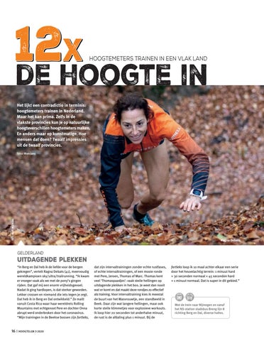 de hoogte in Het lijkt een contradictio in terminis: hoogtemeters trainen in Nederland. Maar het kan prima. Zelfs in de vlakste provincies kun je op natuurlijke hoogteverschillen hoogtemeters maken. En anders maar op kunstmatige. Hoe mensen dat doen? Twaalf impressies uit de twaalf provincies.