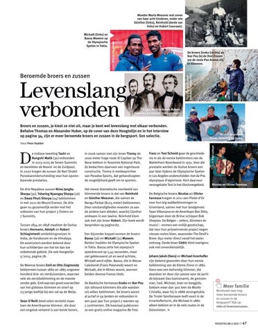 Broers en zussen, je kiest ze niet uit, maar je bent wel levenslang met elkaar verbonden. Behalve Thomas en Alexander Huber, op de cover van deze Hoogtelijn en in het interview op pagina 34, zijn er meer beroemde broers en zussen in de bergsport. Een selectie.