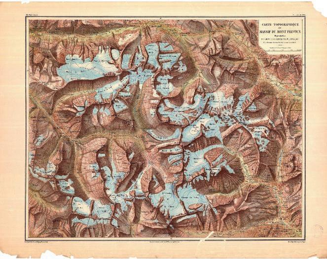 1:40.000 kaart van het Massif du Mont Pelvoux, in 1874 gepubliceerd door de Club Alpin Français. Dit is een verbeterde weergave van de originele manuscriptkaarten gebaseerd op de metingen van Durand.