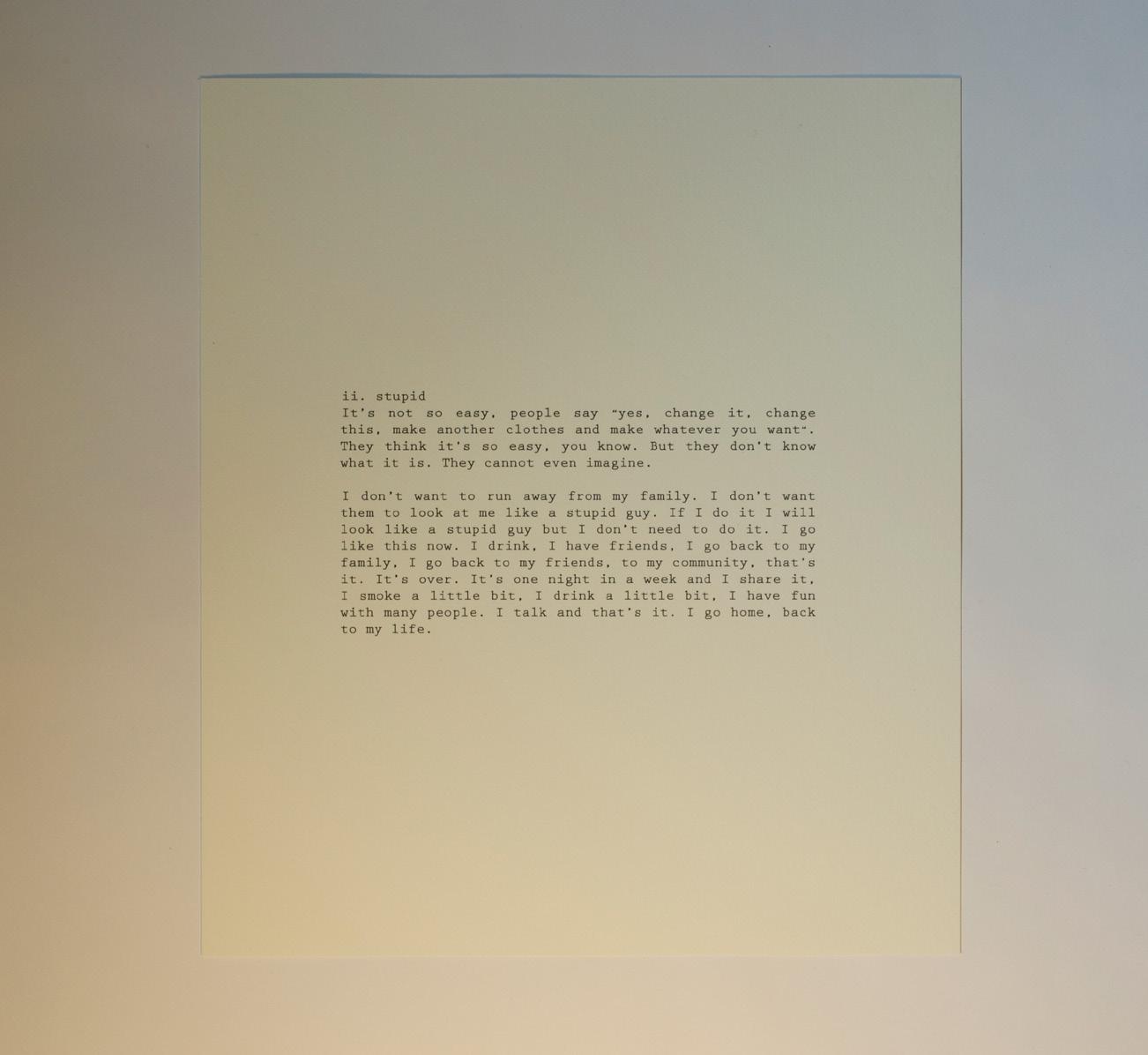 In my work I observe, follow, sometimes obsess, and then adapt to narrate what I see. I am particularly interested in the truthful depiction of cultural phenomena, and I have been wondering how to transform research to material practice - a transformation into a subjective representation.