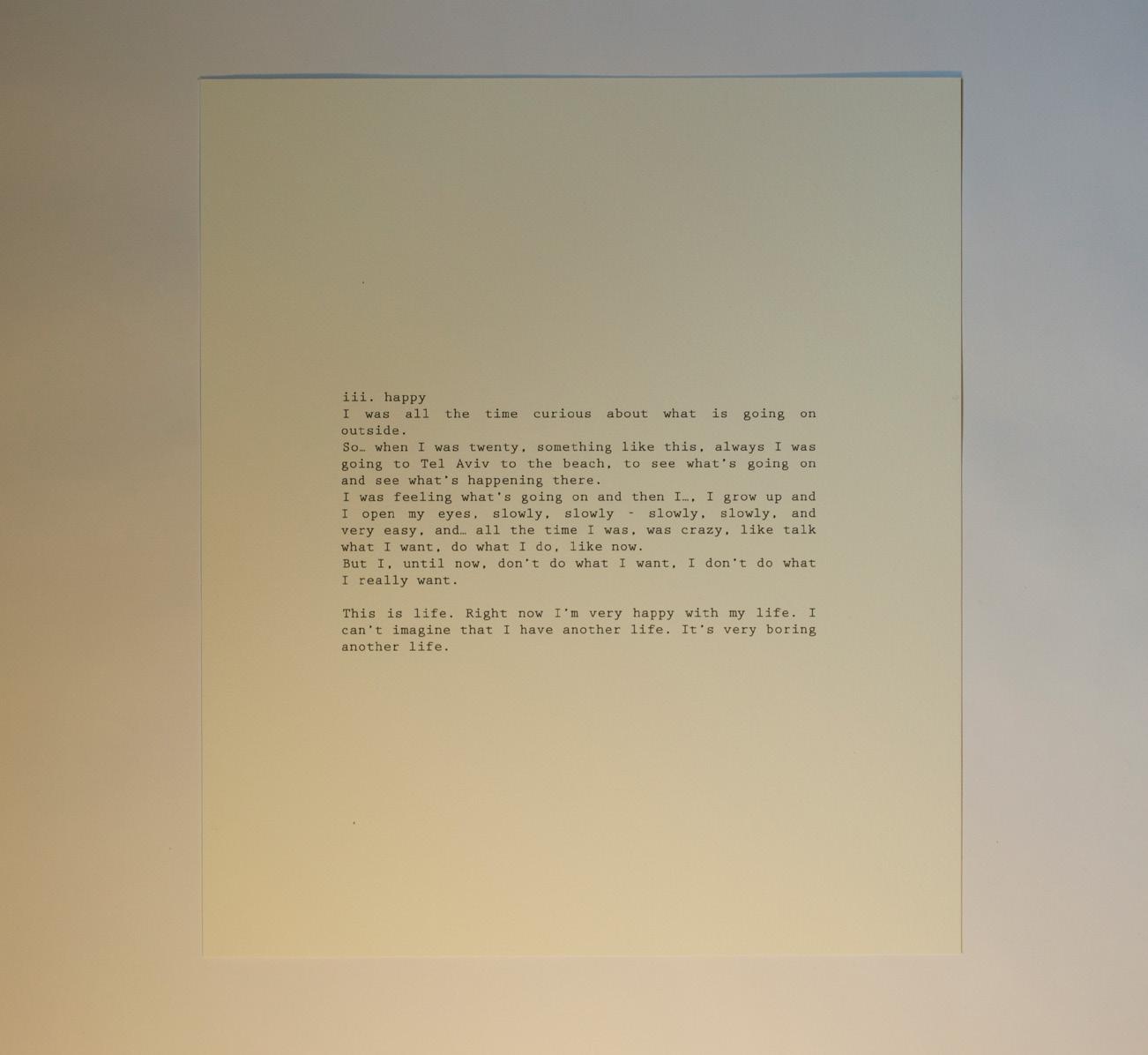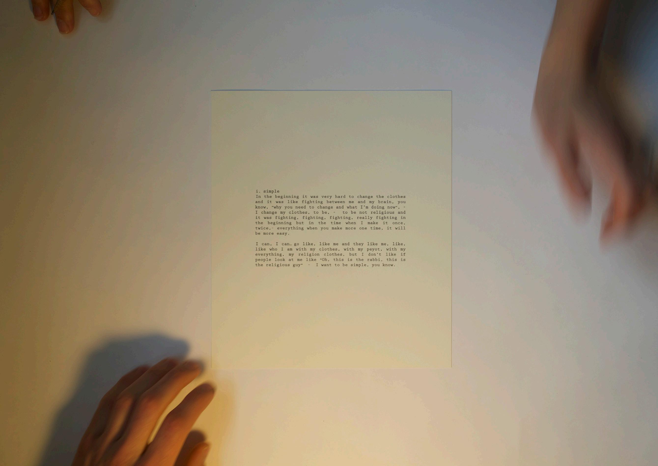 I created this piece in a class on communication with text in intercultural contexts. In 2017, I lived in Jerusalem for six months. The piece was made for this class and was based on an interview I made with a friend. It deals with the question of the connection of two seperate worlds within one culture. At the same time it tries to reproduce the intercultural conflict in a place that is entirely foreign to it.