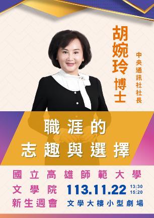 本次邀請到中央通訊社社長胡婉玲 博士,演講〈職涯的志趣與選擇〉一題。