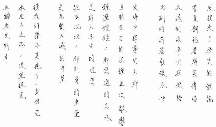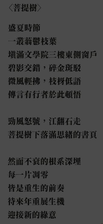 照已經倒塌的樹與自己,沉痛萬分。全 詩透過每四句一轉韻的形式,在今昔之 間不斷交錯對比;韻腳由平聲、去聲至 入聲,情感愈加急切、愈加深沉。