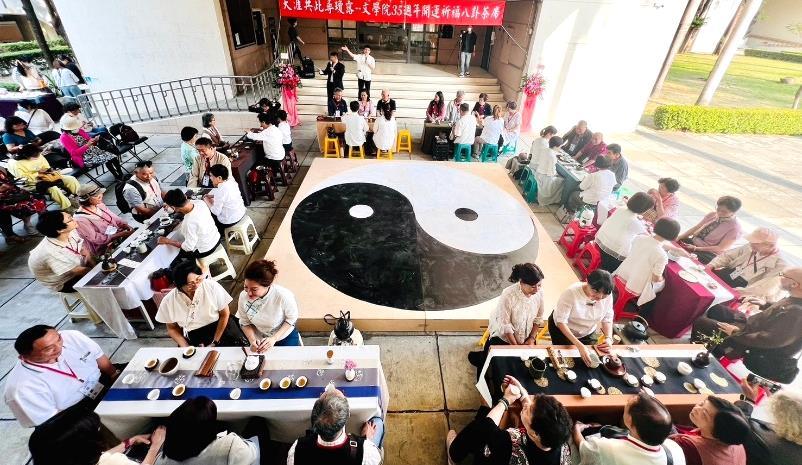 餐會結束,緊接著是「天涯共此尋瓊 露 文學院35週年開運祈福八卦茶席」 活動。八卦茶席是將八種不同的茶種, 以八卦陣的形式擺放,象徵陰陽和諧與 自然之美。在與會貴賓開鑼儀式之後, 茶席於圖書館穿堂盛大舉行。司茶人員 由文學院經學研究所同學擔任,現場茶 香四溢,賓主盡歡,傳遞了對文學院未 來祥和順遂的美好期許,更成為院慶活 動中不可錯過的亮點之一。
