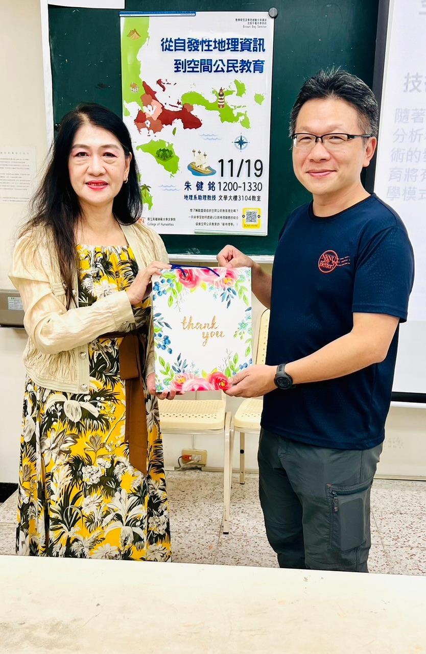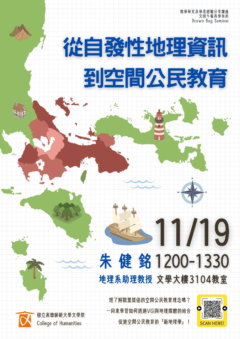 本次邀請到本校地理學系學系朱健銘助理教授, 演講〈從自發性地理資訊到空間公民教育〉一題。朱 教授畢業於臺灣大學地理系碩博士,畢業後先後任 教於醒吾技術學院、文化大學地理系,今年始於本 校地理系,教授「區域地理學」、「網路地圖學」與「地 理資訊系統專題研究」等課程。朱教授貼近學生生活 的教學內容,深受學生喜愛。本次演講將介紹過去 對群眾行為與空間分布的研究成果,並提出如何透 過 「自發性地理資訊」(VGI)與地理媒體的結合, 如何進一步促進「空間公民教育」的進行。