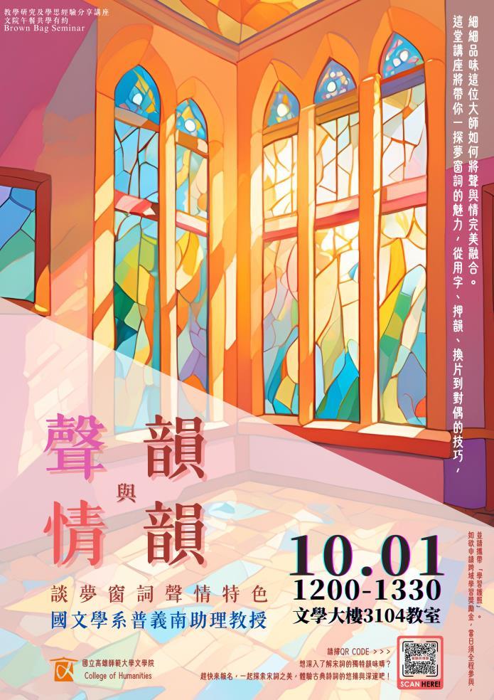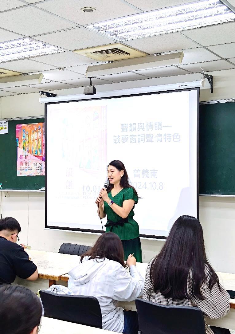 本次邀請到本校國文學系普義南助理教授,演講〈聲 韻與情韻 論夢窗詞聲韻特色〉一題。普教授於「吳文英 (夢窗)詞」研究領域中深耕許久,自淡江大學博士班畢 業後,普教授繼續留於母校任教,並主持「吳文英詞韻律 分析」(104年)、「宋詞換頭研究」(110年)等計畫。今