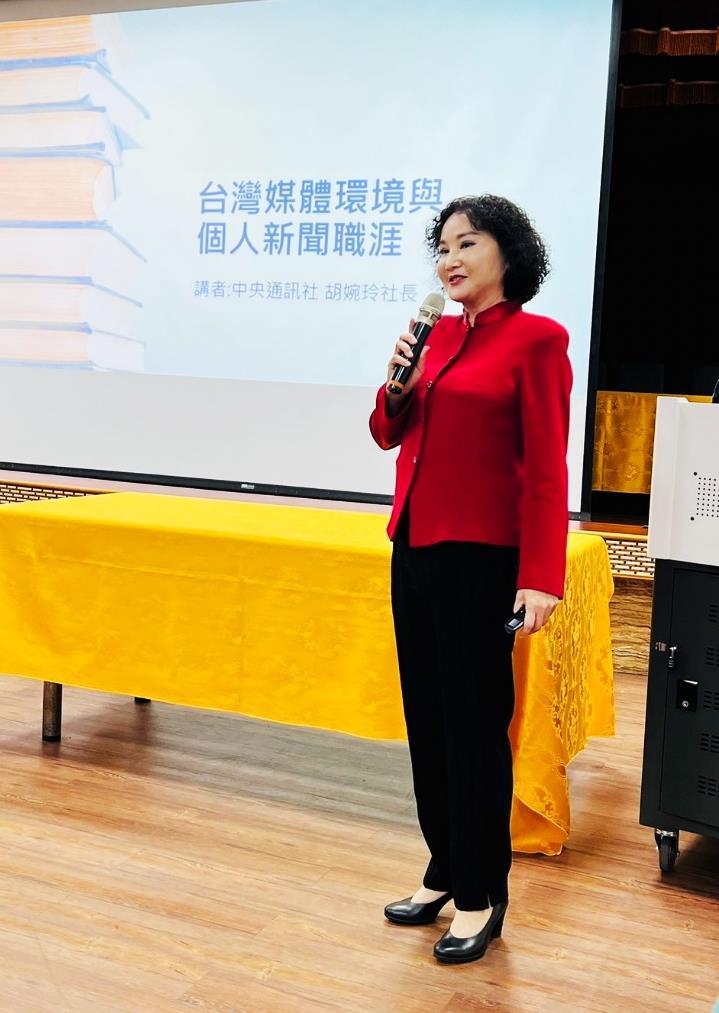 接著,胡社長談到她今年接任中央 通訊社社長的歷程,並分享了對這份職 務的使命感與願景。中央通訊社作為臺 灣最具歷史的新聞通訊社,負責辦理國 內外新聞報導,服務各類媒體,並肩負 對外傳遞臺灣聲音的責任。中央社在海 外設有超過三十個駐點,分布於五大 洲,不僅展現了中央社的國際視野,也 使臺灣能迅速掌握全球重大新聞事件, 並有效促進國際對臺灣的理解與支持。