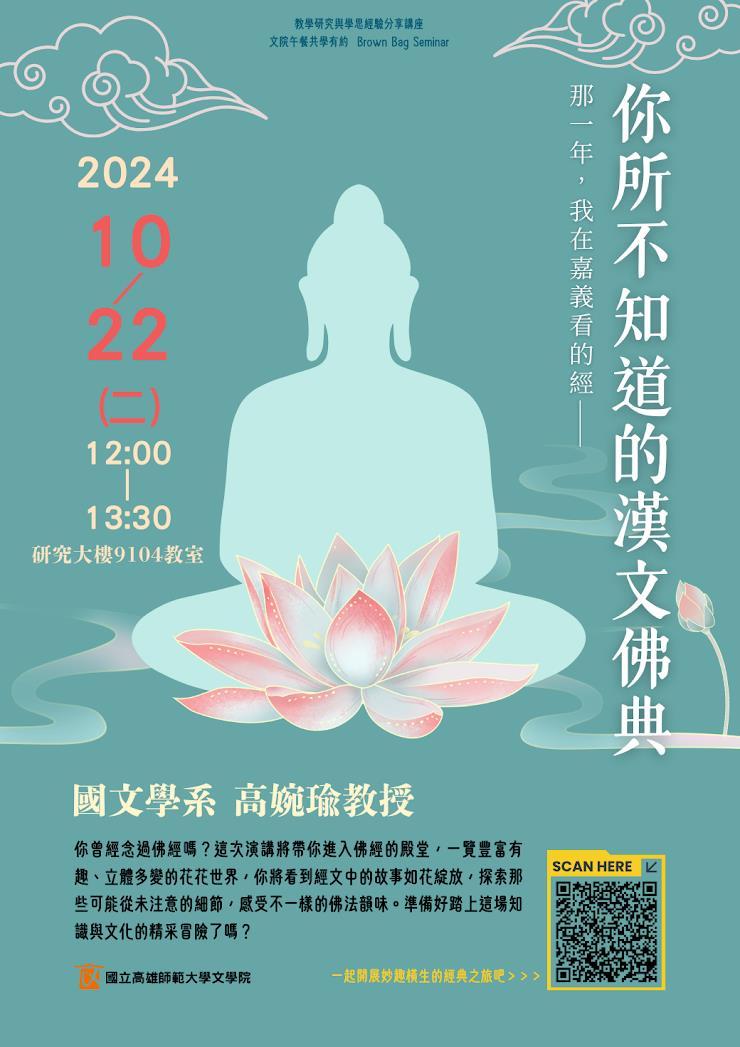 本次邀請到本校國文學系高婉瑜教授,演講〈那一 年,我在嘉義看的經 你所不知道的漢文佛典〉一 題。高教授於中正大學中國文學研究所碩士班研究文 字學,博士班轉向研究佛經語言。畢業後,先後於淡 江大學與本校國文系任教,其授課科目涵蓋文字、聲 韻、訓詁、漢語語法、詞彙等,十分多元。另外,高 教授治學嚴謹,也曾多次獲得科技部(國科會)大專 院校特殊優秀人才獎勵。本次演講即以高教授自身的 經驗,介紹漢文佛經中不為人知的一面。