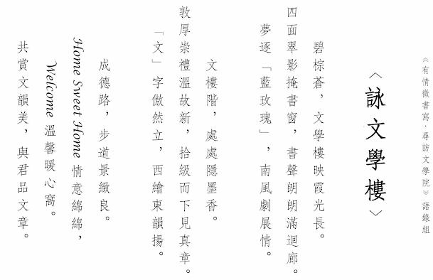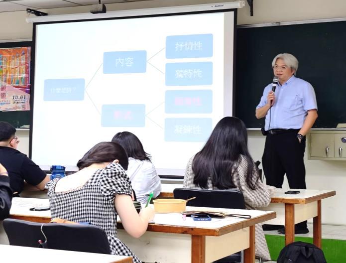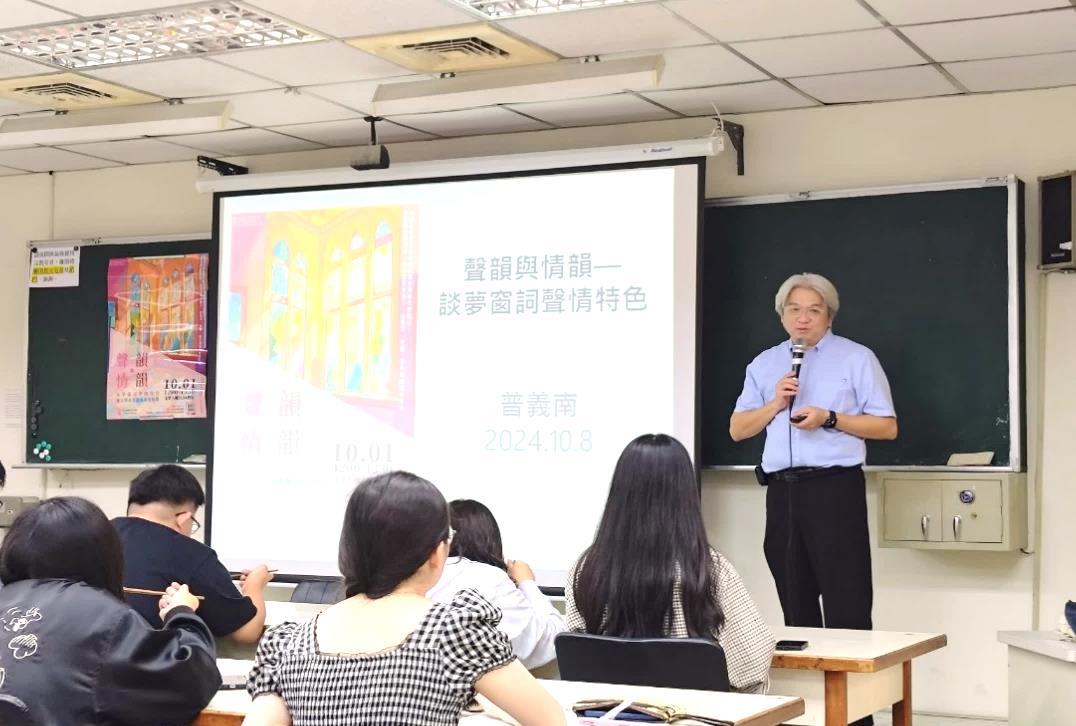 年本校國文系延攬普教授,教授「詩選及習作」、「詞選及 習作」、「曲選及習作」、「專家詩」與「修辭學」等課程。其 幽默風趣的教學風格,也深受學生喜愛。本次演講即以 「夢窗詞」與其他詩人為例,探討古典詩詞如何透過「形 式」,精準表達溢於言表的「情感內容」。