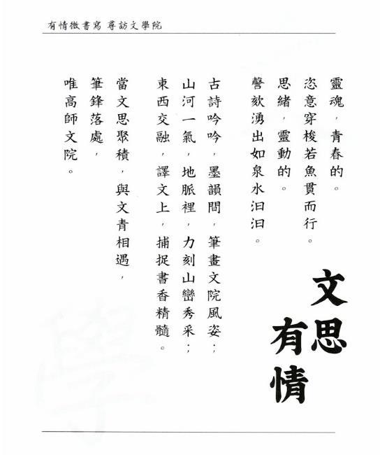 文學院於12月6日舉辦35週年院慶活 動,由高師大校長王政彥、前副校長王 惠亮、前院長陳靖奇、前院長張玉玲等 與會貴賓,共同見證這個歷史性的里程 碑。本次院慶活動內容豐富多元,包括 回顧文學院的發展歷程、展示學生的創 作成果,並舉辦獨具特色的開運祈福八 卦茶席,歡迎師友一同品茗,更有一系 列人文藝術表演,充分展現文學院深厚 的人文底蘊與文化藝術魅力。