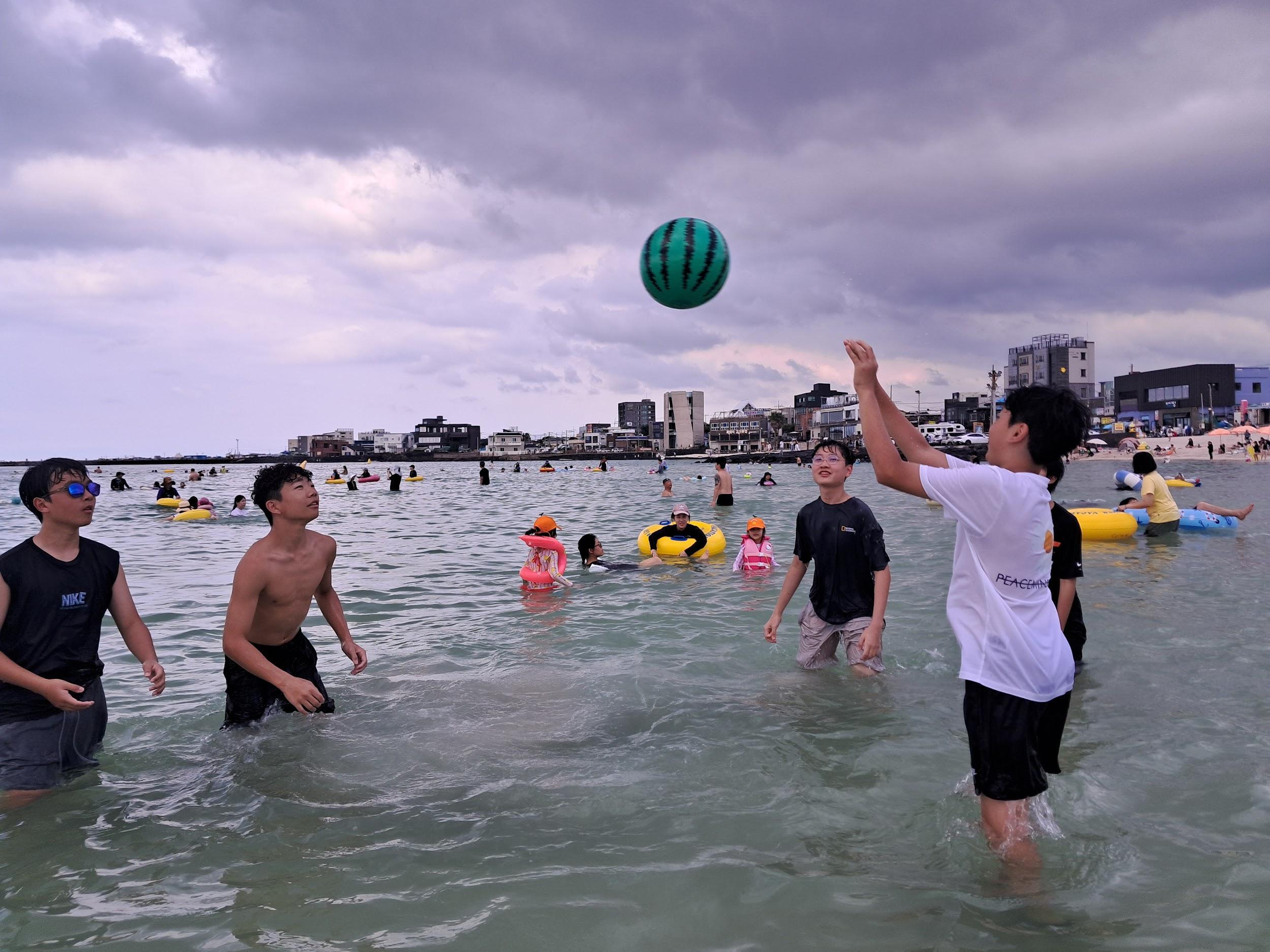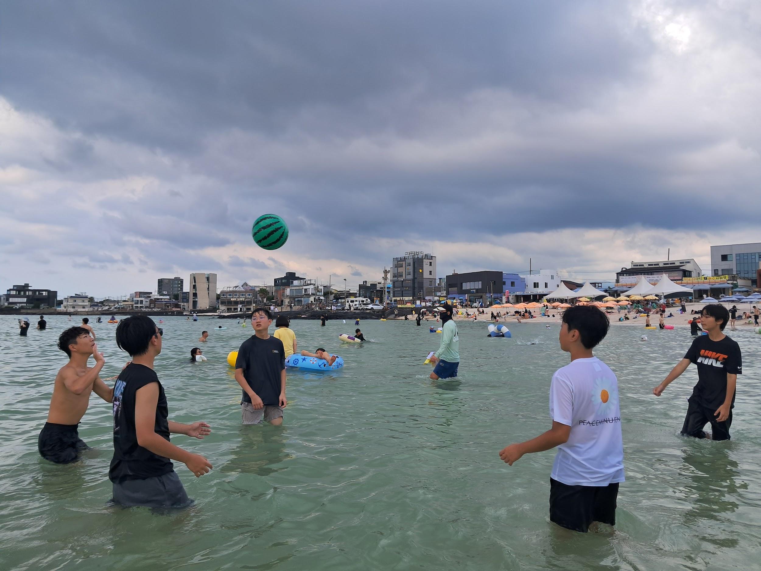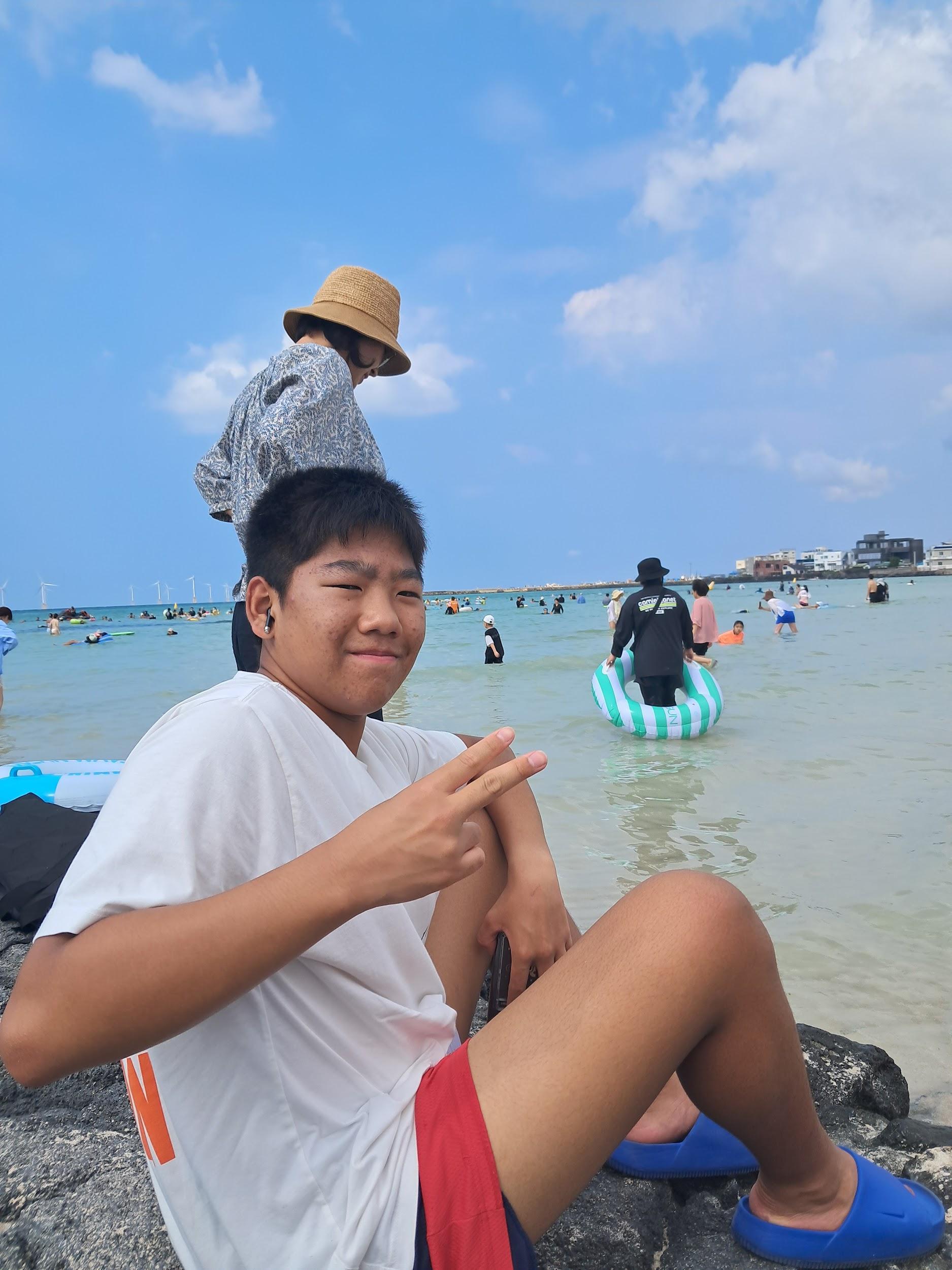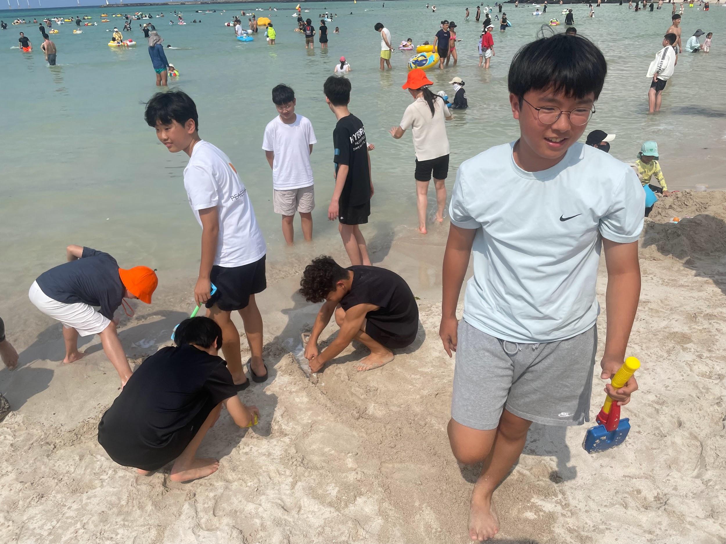 On August 30th, we all went together to Hyeopjae Beach with our friends. It was the first trip after we came back to Aewol and school. We enjoyed a beef barbecue, sweet drinks,andlotsofotherdelicioussidedishes. After our meal, lots of the students went into the water and enjoyed the refreshing surf. By theendoftheday,wewereallwet,coveredin sand, and exhausted. The Aewol staff bought us ice cream. Lots of students, including us, bought a ball and played beach volleyball. Luckily, it rained when we finished our beach day,andlotsofpeoplegotwetfromtherain.It wasthebestbeachdaywithmyfriends.