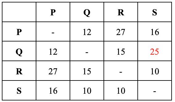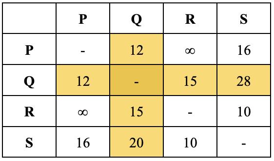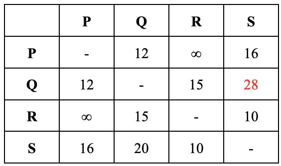 IfweseethepositionRowQ,ColumnSfromthe distancetable,wecanseethatavaluethathasbeen replacedinthepreviousiterationhasalowervaluein thethirditeration.Inthiscase,replacethevalueonce morelikethetableabove.