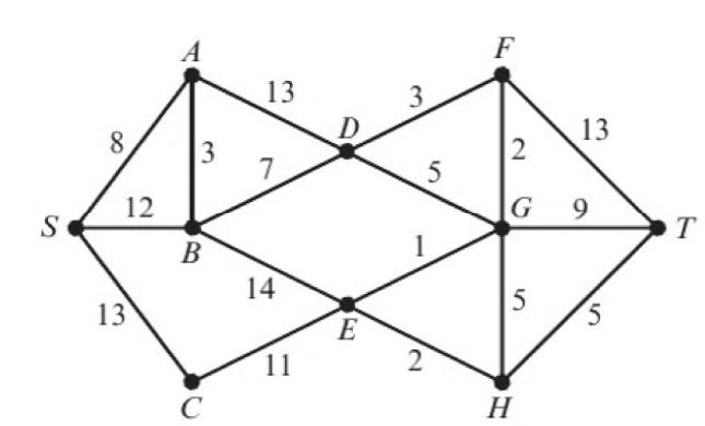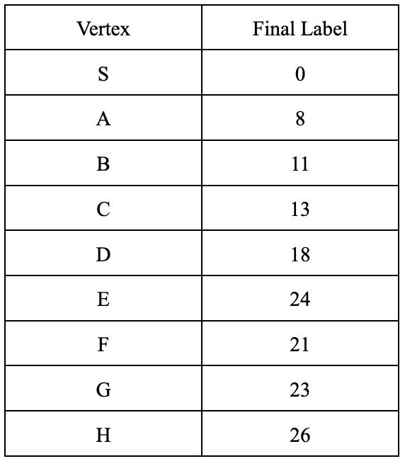 Bymatchingtheweightandthefinallabel,select thevertexwhichmatchesitsfinallabelandthevalue offinallabelofvertex T -weightlinkingthevertexwith vertex T .Inthisexample,therearethreeoptions,vertex F ,vertex G andvertex H .Vertex F andvertex G cannotbethenextvertexsincethetwovaluesdonot match.Thisleaveswithvertex H ,whichbecomesthe nextvertex.Repeatthisprocessuntilwereachbackto thestartvertex.Therecanbemultipleroutesforthe shortestdistanceandinthiscase,therearetwopossibleroutes. SCEHT and SABDGEHT .Eitherofthem arecorrect.