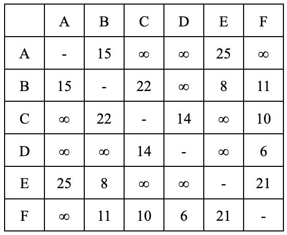 Finally,supposethattheshortestroutewewantto findisfromvertexAtovertexC.Findthevaluefrom thedistancetablewiththestartingvertexontherow andthedestinationvertexonthecolumn.Thisvalue representstheshortestdistancefromvertexAtovertex C.Inordertofindtheroute,findthealphabetwith thesamemethod.IfthealphabetisB,thisissuggestingthattheshortestroutefromvertexAtovertexC requirestopassthroughvertexB.