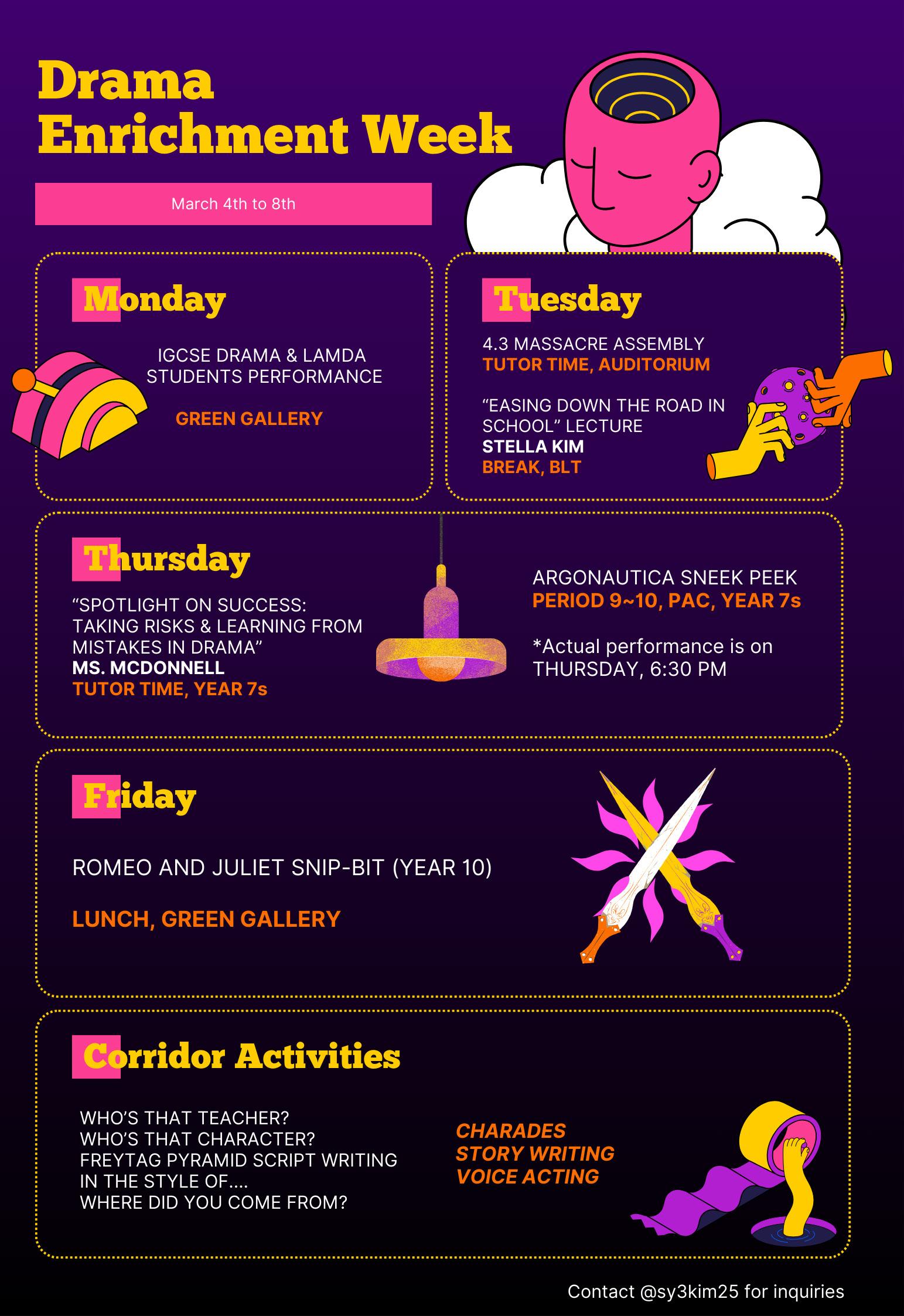 本周是戏剧强化周。校园里举行了许多活动。其中包括周四晚上的《阿尔戈英雄 记》演出,该剧改编自拉丁史诗,讲述了伊阿宋和他五十位英雄伙伴在阿尔戈号 船上的冒险故事。演出一如既往地高水平,舞台布置精巧,所有演员、技术人员 和幕后工作人员都十分出色。此外,我们还欣赏了《罗密欧与朱丽叶》的演出, 还有我演你猜、故事创作和配音表演等一系列活动!