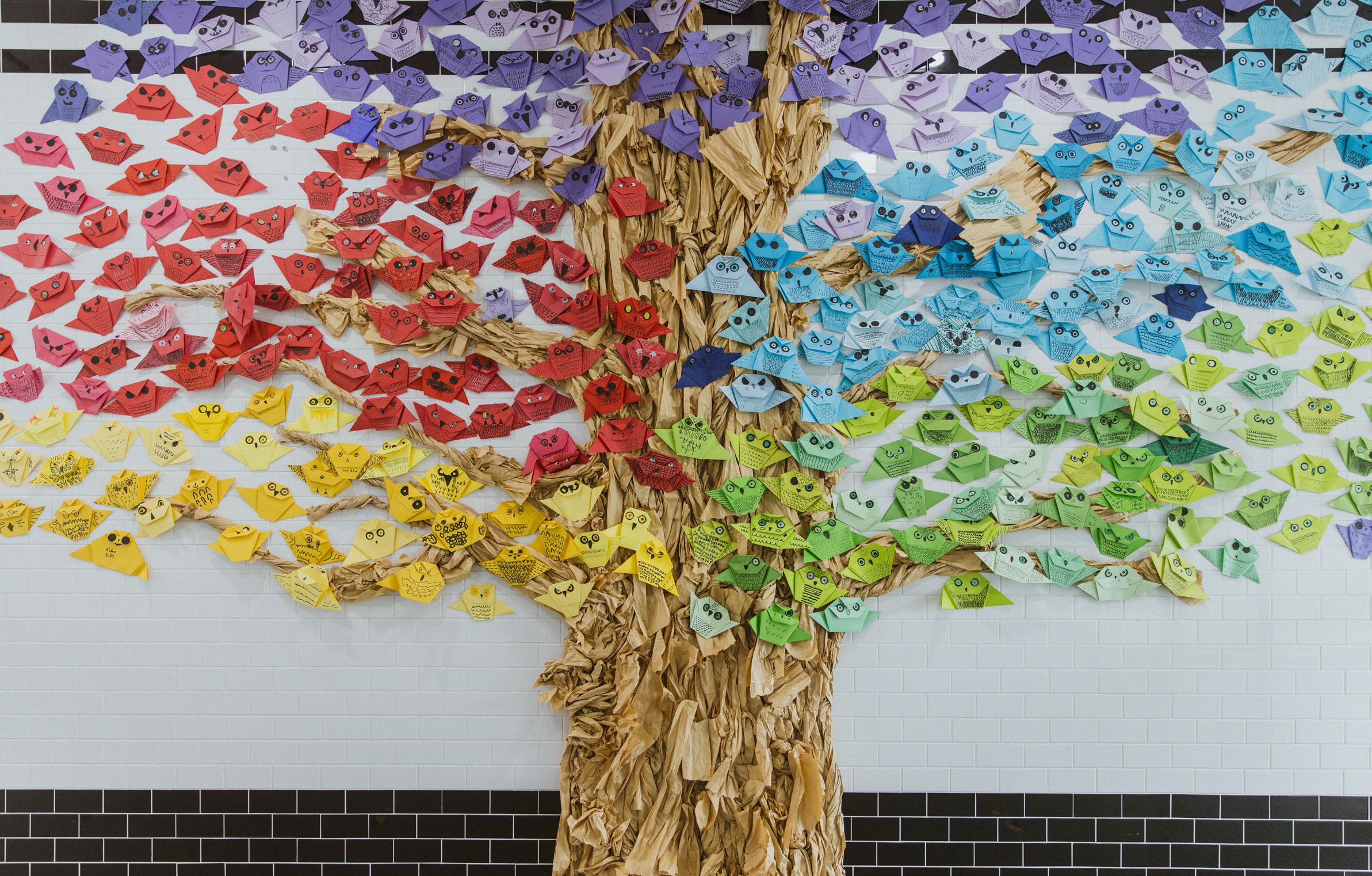 “今年起小学部在我们的学习习惯中加入了‘友善’这一条。艺术部门将它作为学院 艺术活动的主题,每位同学都用自己所在学院的颜色制作了一个猫头鹰折纸作 品。艺术大使们、艺术CCA和Bryant 小组的学生、和我们一些热情的3、4年级的 学生们一起制作了巨大的树干,作为色彩斑斓的猫头鹰的家,拼出以下内容: We will ‘owl’ways be kind!