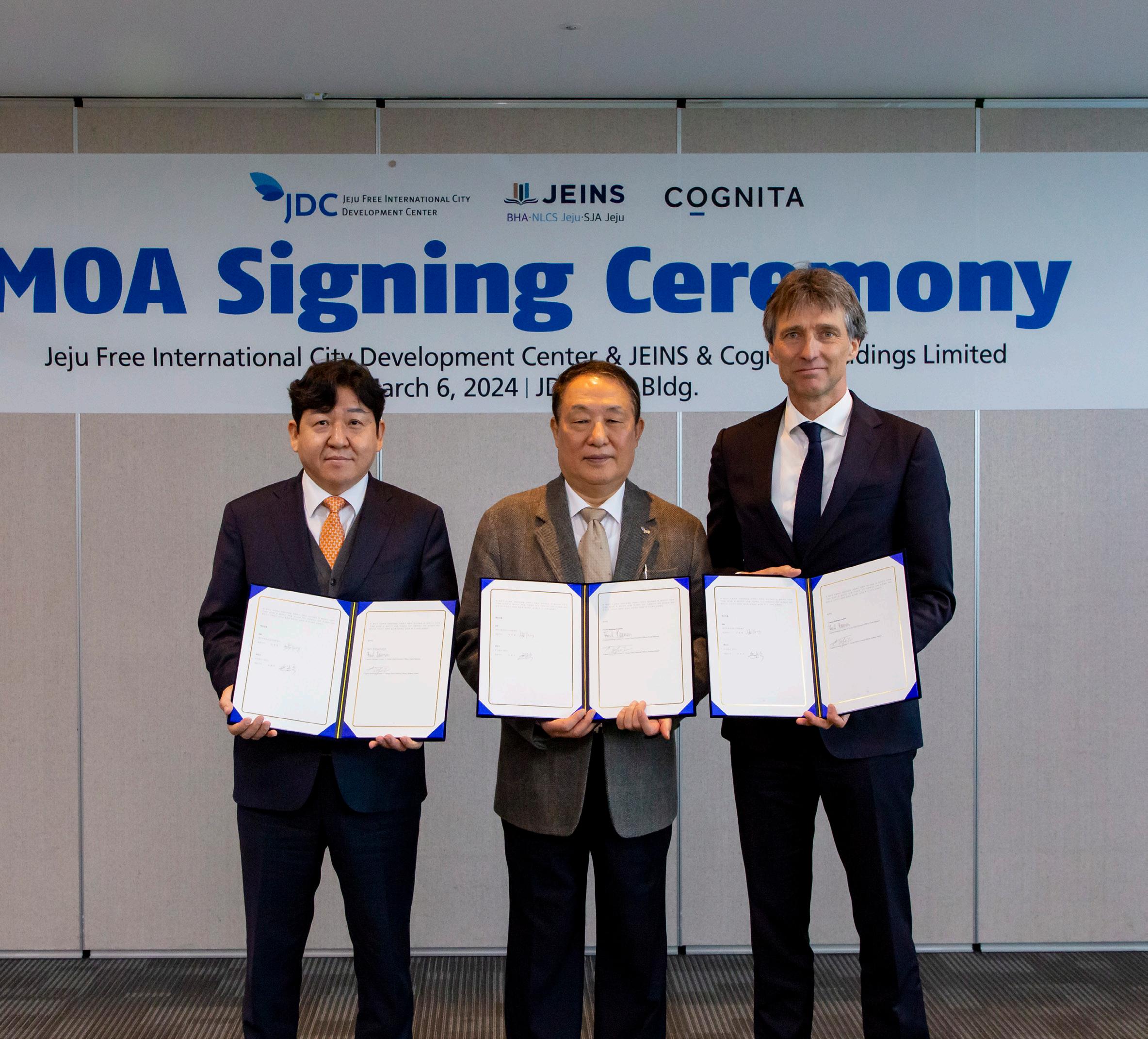 学校管理法人JEINS的首席执行官 Mr. Bongsoo Son 和校长很高兴地宣 布,Cognita, JDC和JEINS 于3月6日本周三在JDC总部签署了谅解备忘录 (MOA) 。签署之前, 集团总裁Dr. Frank Maassen, 集团首席财务长Mr. Andreas Tolpeit (Group CFO) 和亚洲区财务长Mr. Peter Wiki (CFO, Asia), 在学校领导团队成员, 学生代表 Brandon (男生主席), Stella (女生主席), Dante (小八学生) 和 Dahyun ( 小八学生)的陪同下,又进行了一次校园参观。