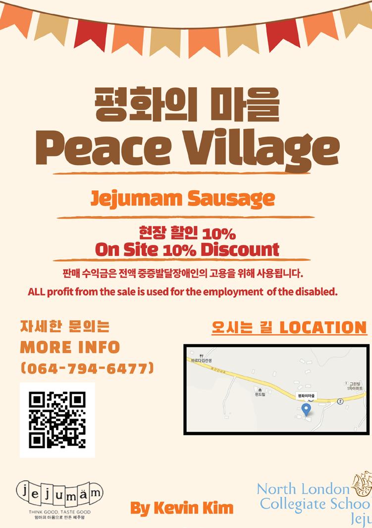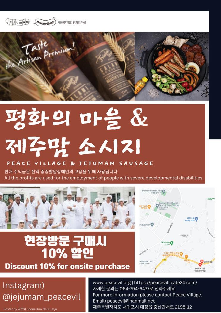 ….and finally PEACE VILLAGE AND JEJUMAM SAUSAGES 我们的一项课外服务活动是支持本地的慈善机构—和平村,该机构为有发育障碍 的青年提供工作--而他们辛勤工作的结果是制作出美味的手工香肠和火腿。 作为CCA的一部分,我们的学生访问和平村,和利用福利中心的人们一起,参加 令人愉快的活动。感谢我们的学生制作宣传海报,让这些伟大的工作能持续下 去。如您想更多了解该项目或如何购买他们的产品,请联系Mr. Gwangho Im ghim@ nlcsjeju.kr 제 주 특 별 자 치 도 서 귀 포 시 대 정 읍 구 억 리 3 0 8 평화의마을 제주맘 소시지 JEJUMAM SAUSAGE 무 항생 무 방부제 무 색소 무 인공조미료 장점 no ant sept c no art f c a season ng no art f c a falvour ng o food co ou g WHAT MAKES IT SPECIAL LOCATION : Y 3 0 8 G u e o k r i D a e j e o n g e u p S g p J d 1 0 % 세 일 1 0 % D I S C O U N T 매장 방문 ON SITE VISIT 주소 : Made by Dongmin & Donghyuk 지적 장애인들의 평화의 마을에서 오직 제주에서만 나는 청정 먹거리로 사회적 가치를 만들어가는 제주맘 소시지 세상에 단 하나 뿐인 특별한 소시지, 제주맘 소시지 중증지적장애인들의 직업생활을 위해 설립된 평화의 마을에선 지적 장애인들과 비장애인들의 협업이 대한민국 최고의 유기농 수제소시지를 만듭니다 이 사회적 기업의 소시지의 퀄리티는 HACCP LOHAS 인증과 더불어 LOHAS award 최우수상 IFFA 금메달 6 부문에 특별상까지 제주우수제품 품질 마크 네 가지의 특허가 자랑스럽게 보증합니다 @jejumam peacevill 064 794 6277 https //peacevi cafe24 com/ ndex htm 지적 장애인들의 평화의 마을에서 오직 제주에서만 나는 청정 먹거리로 사회적 가치를 만들어가는 제주맘 소시지 세상에 단 하나 뿐인 특별한 소시지 제주맘 소시지 제주맘 소시지는 이래서 특별합니다 : 무항상제 제주 흑돼지 5대 화학첨가물 無 생산에 필요한 야채류 모두 직접 유기농 농사 HACCP 인증 100% 식품안전경영시스템과 보조료 無 첨가 철학으로만 만듭니다 판매 수익금은 전액 중증발달장애인의 고용을 위해 사용됩니다 M d b M h Ch A B O U T U S & W H A T W E V A L U E 평화의 마을 제주맘 Peace Vi age & Jejumam www peacev org h ps //peace ca e co T 064 794 6477 E p @h t 제주특별자치도 서귀포시 대정읍 중산간서로 2195 12 www peacev org https //peacev ca e24 com 자세한 문의는 064 794 6477로 전화주세요 For more nformat on p ease contact Peace V lage E p i @h t 제주특별자치도 서귀포시 대정읍 중산간서로 2195 12 Je u a Sausage P g y d th g d t d d g on e u s and Je umam were acknow edged for the con r but on p g d d b g J y p oduct on o sa e food p oducts and he emp oymen o peop e 제주맘 소시지 제주 에서 나 기른 재 만으 만든 명품 소시지 제주맘 랜 는 컬 포드를 통한 제주도 경제의 활성화 안전한 먹거리를 통해 가치 창출 및 중 증장애인과 용최약계층 용확대를 통한 사회적 비용 감 및 제주 의 역량 강화에 기여하며 농식품 원산지 표시 우수업체 인증 및 고용 우수기업 으로 인증받았습니다 발달장애 청년들의 행복한 일자리 제공을 통해 지역사회의 시민으로 더불어 살아가는 사회적 가치를 창출하며 이들의 독립생활을 돕고 있습니다 P t g i i g t g th commun ty by prov d ng jobs for young peop e w th d p t d b l t g t h p th ntegrate to the soc ety be ter and be ab e to ve d p d t y 먹거리의 자치에 집중하기 위해 보존료 색소 인공조미료 대두단백 아질산나튜름 등 첨가물들이 들어가지 않습니다 d t f th f th f d t addit onal chem ca s such as preservatives p g t t fi d t yb p t and sod um n tr te are used n the process of ood p d t No Ant b o cs (무 항생) N P t (무 방부제 No Art f c a Co ours 무 색소 N MSG 무 인공조미료 Non GMO (무 유전자조작 식품) N S d N t it (무 아질산나트륨 No Di uent (무 증량제 판매 수익금은 전액 중증발달장애인의 용을 위해 사용됩니다 A h p f d f th p y t f p p th seve e deve opmenta d sab t es y 김준아