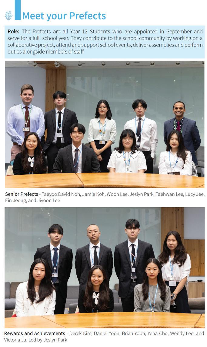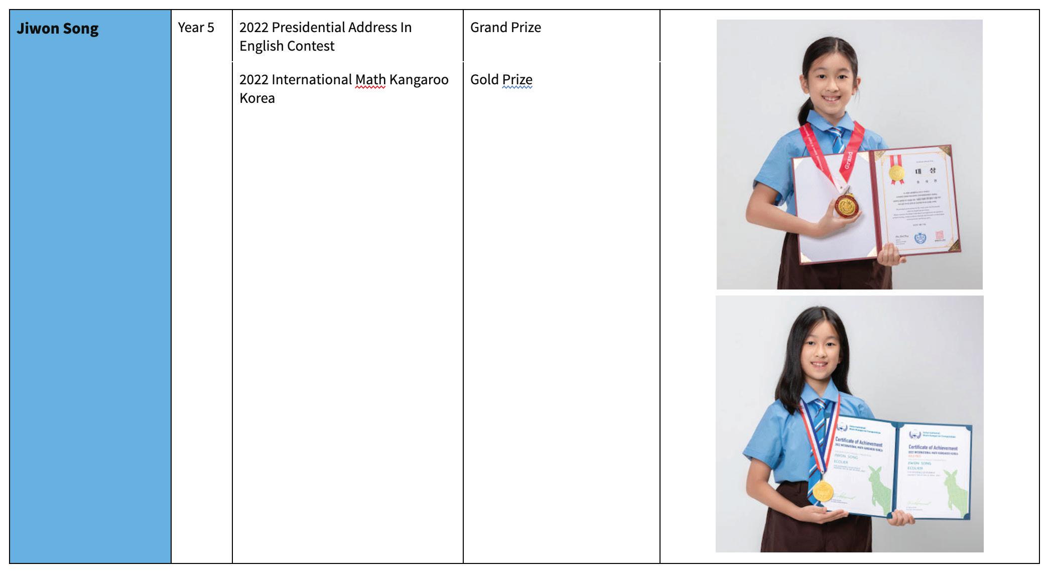 NLCS Jeju Awards and Achievements 获奖者 - for ‘Lighthouse for the visually Impaired Bryant’ - Emily Lim (Y12) 和 Daniel Lee (Y12) 济州道议会 议长奖 韩国青少年活动振兴院 理事长奖 获奖者 - Sarah Park (Y13)) 济州道教育监奖 获奖者 - for ‘Beyond the Shelter Bryant’ - Catherine Kim (Y12), joined by other members - Sophie Lee (Y11) and Bella Kim (Y10)