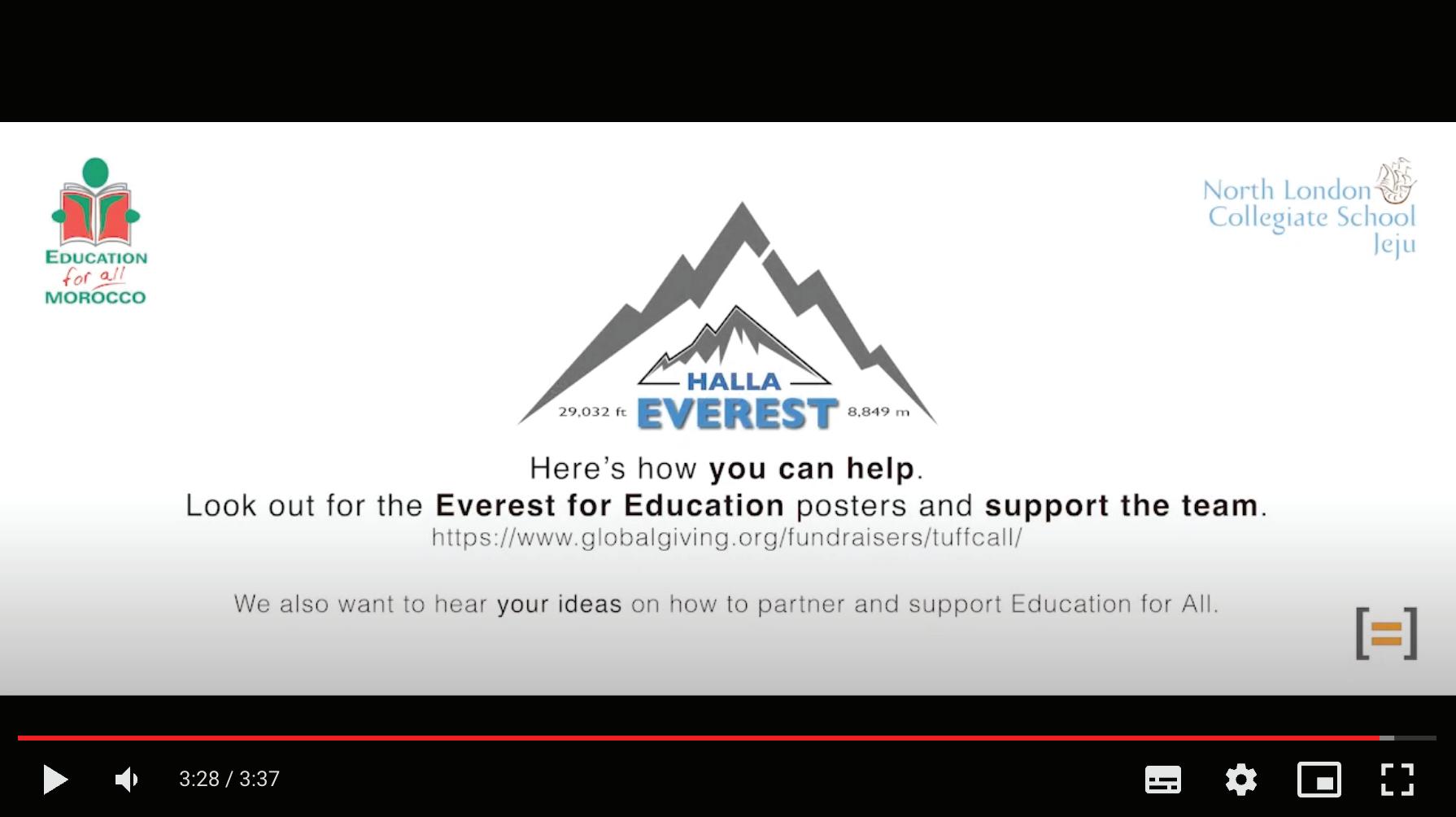 Other news “这是一个美妙的经历,很高兴我有这个机会。受教育一直是我的一个梦想,这 个梦想已经实现。但是,成为一名教师是不可能的--即使在梦中......但现在我 却到了这里!我觉得我的学生们真的需要我。我可以看到当年我们在学习时遇到 的所有问题,以为没有人理解我们。我可以帮助他们。我可以告诉他们,教育是 解决你在世界上所有需求的关键。通过教育和努力工作,你能让不可能的梦想成 真。”... 学校正在与全民教育组织开展一系列的合作设想,其中包括CAS、学院、学科部 门和服务倡议。 EFA是Tower Aid支持的慈善机构之一,今年10月27日便服日的捐 款将用于它们。此外,11月13日,一群老师将通过“Everesting for Education” 活动来筹集资金。该活动是简单但异常艰苦的挑战。他们必须骑自行车登顶汉拿 山13次,累积路程达到珠穆朗玛峰的高度8849米。这可能很辛苦,但用老师们的 话来说,“这反映了孩子们受教育所做的努力” 。 祝愿 Mr. Tuffs, Mr. Heydinger, Mr. Roberts, Mr. Gumus, Ms. Sannegadu 和 Mr. Brown好运!请了解、分享、赞助他们: https://www.globalgiving.org/ fundraisers/tuffcall/ 正如Khadija所说, “我能有所回馈,全要归功于全民教育组织给我的机会。感谢北伦敦济州,我们 珍视你们的支持。” 链接 https://www.globalgiving.org/fundraisers/tuffcall/ https://www.efamorocco.org/ https://everesting.cc/