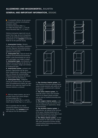 1_ The »Cornice« interior system_ the main features of this prize-winning interior system include elements with widths of up to two meters, combined with a delicate frame design 2_ The »Uno« interior system_ fits e specially easily in every room situation thanks to its elegant design principles and can also be modified extensively after installation 3_ The »Legno« interior system_ a classic and elegant storage area solution that puts the emphasis on appearance, design and functionality 4_ The »Ecoline« interior system_ is cost-effective, yet tailored to the structure of the space; individual details (such as the standard baseboard recess) allow installation in almost any room situation 5_ The »Rima« interior system_ an intelligent solution for tight spaces: the adjustable closet components increase storage capacity without obstructing access to the storage space behind