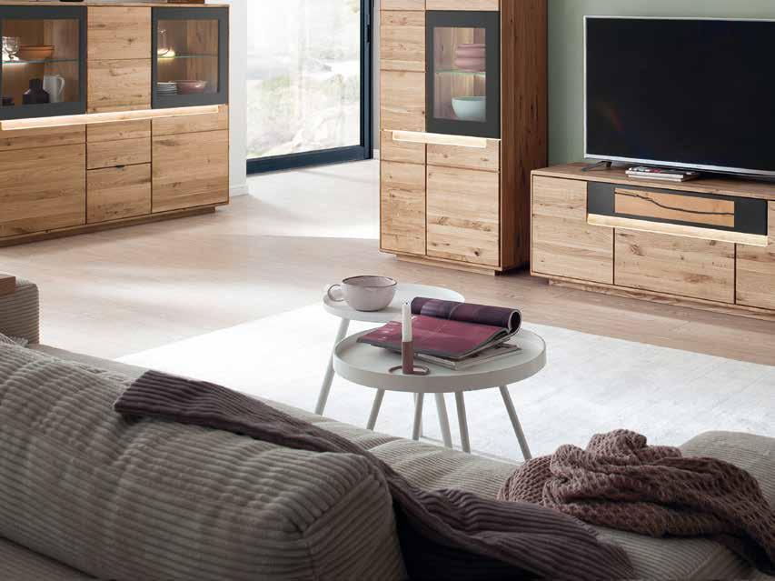 Massive Eiche geölt in der perfekten Symbiose mit geschroppten Akzenten und edlen mattschwarzen Glasfronten.