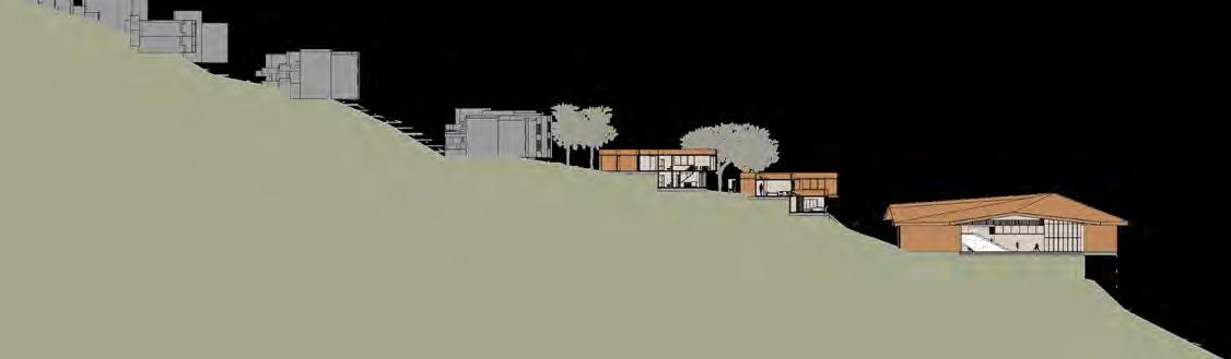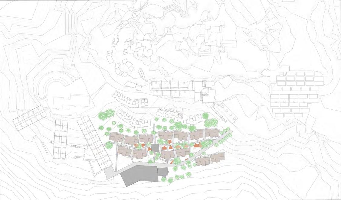 ADAPTING TO THE DYNAMIC CHANGES IN ELEVATION, THE MODULE PROVIDES ITS RESIDENTS WITH A SCENIC VIEW OF THE MOUNTAIN RANGE. THE LAYOUT OF THE UNITS ALSO HIGHLIGHTS THE THREE CENTRAL SPACES, THE MOST PROMINENT PLAZA FORMED IN THE INNERMOST ZONE OF THESE UNITS.