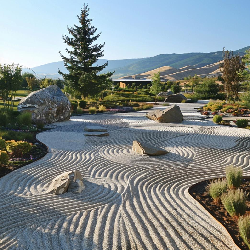 ZEN GARDEN - perspective that illustrates the scale of the structure. Traditional zen gardens take inspiration, in part, from the natural surroundings and try to capture the landscape in miniature form. This garden is no different, as it took inspiration from the Missoula floods that sculpted the landscape during the last ice age, leaving behind massive ripples in the land and depositing erratic boulders along it’s path.