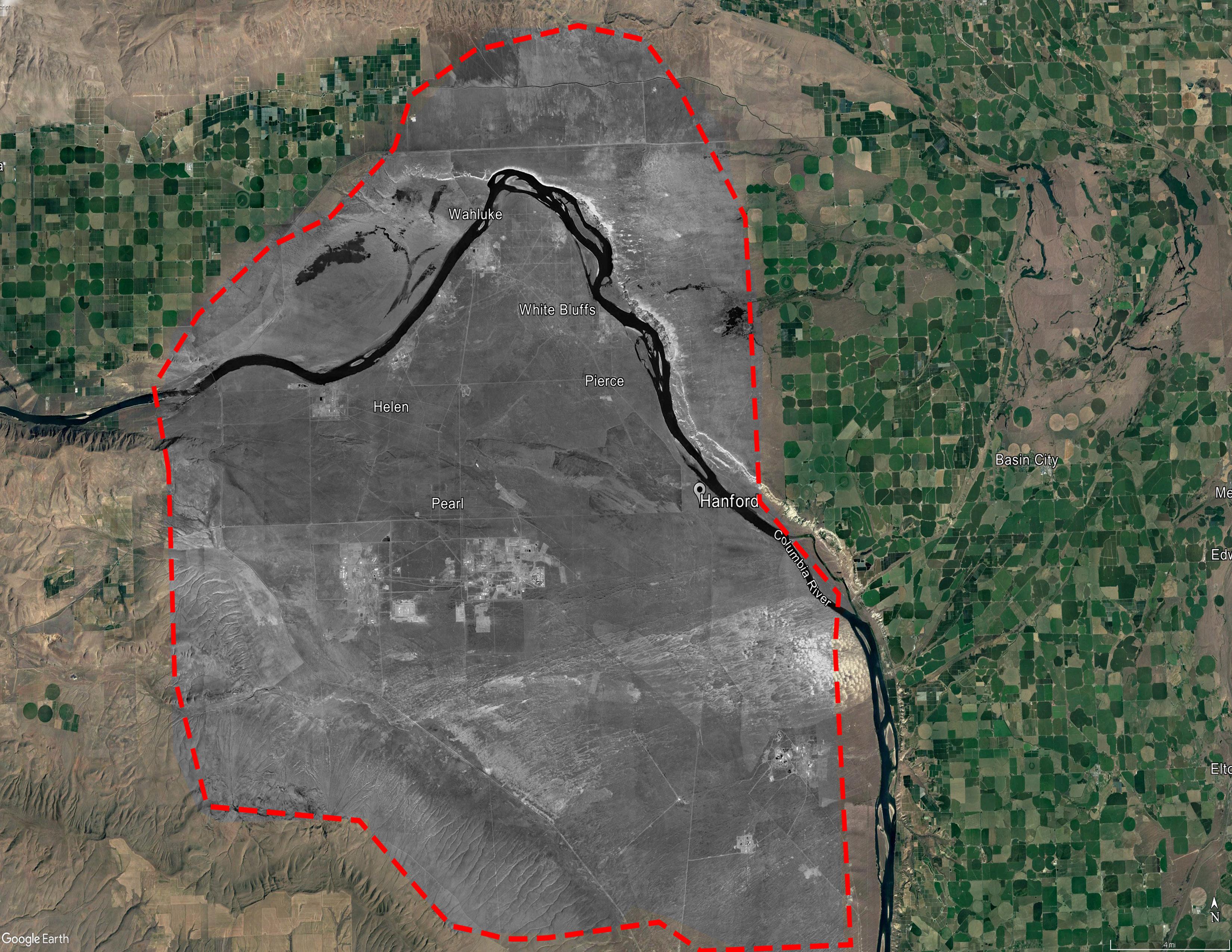 The Hanford Nuclear Site is situated in southeastern Washington State, United States, along the banks of the Columbia River. Spanning approximately 580 square miles (1,500 square kilometers), it occupies a remote and sparsely populated region known as the Hanford Reach, named after a portion of the Columbia River that flows freely through the area. Surrounded by arid desert terrain and characterized by vast expanses of shrub-steppe vegetation, the site is nestled amidst the rolling hills and plateaus of the Columbia Basin.