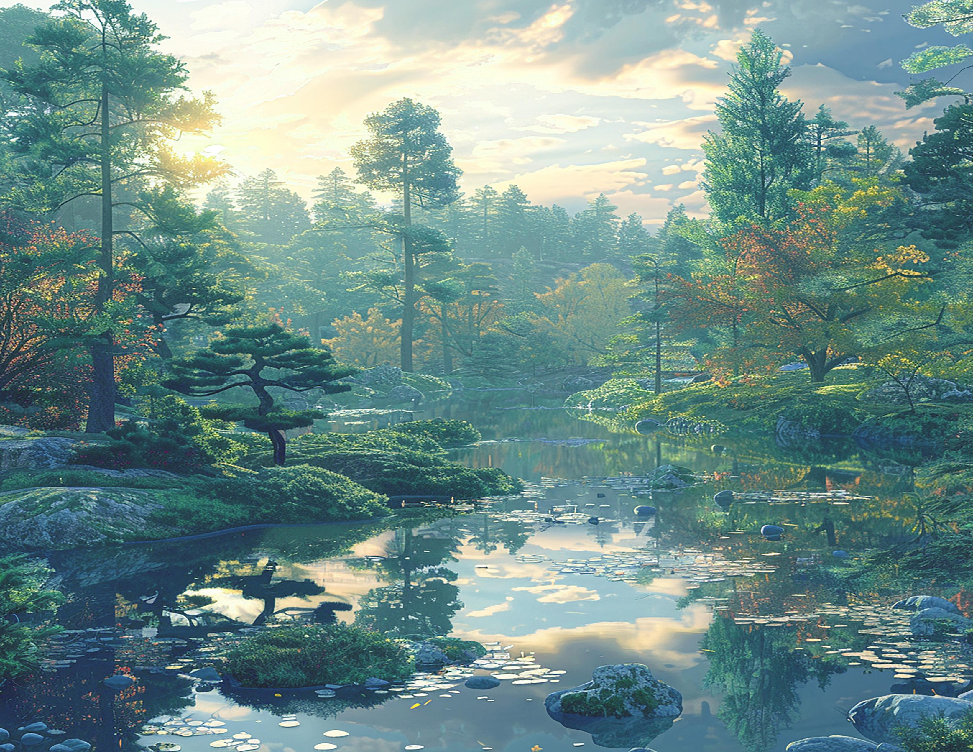 This book profiles a number of the most notable gardens in Japan and beyond. It states that the goals of a Japanese garden are to suggest a landscape, to depict famous natural scenes, or to evoke a particular artistic quality or atmosphere.