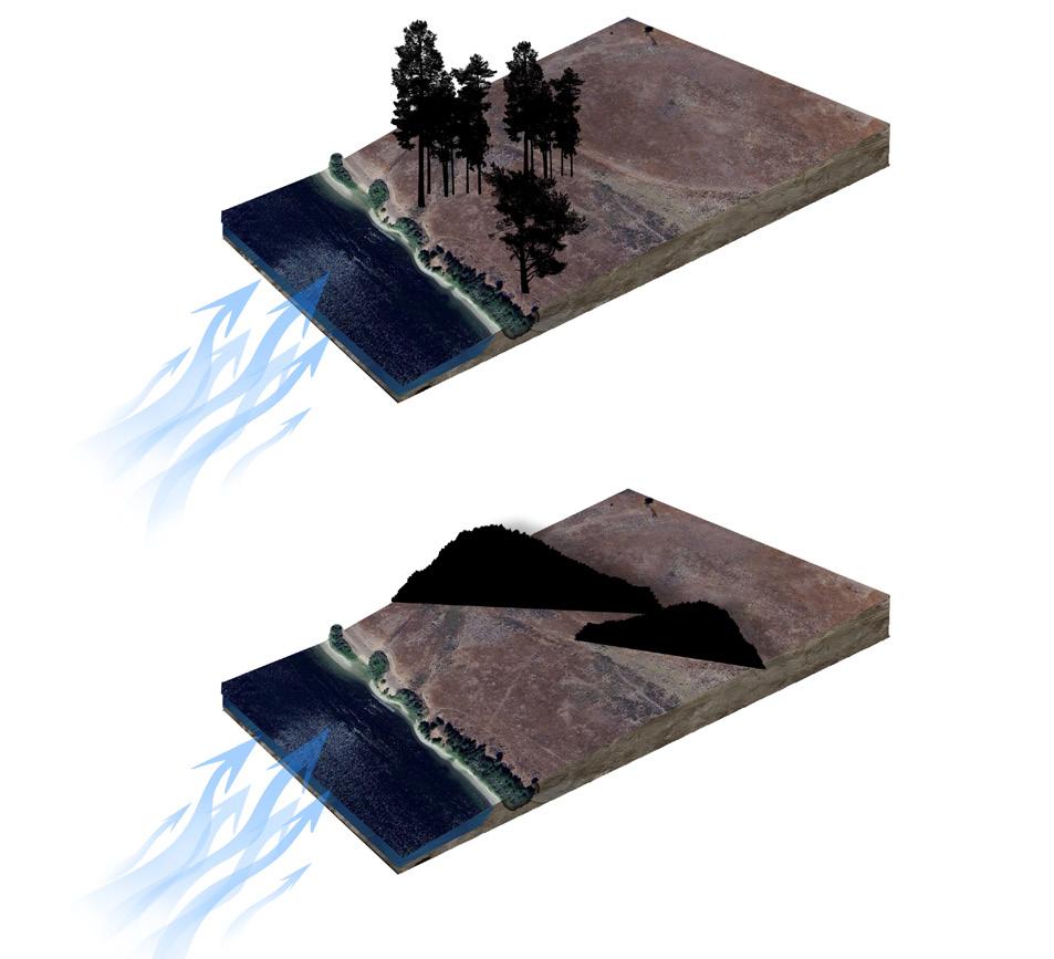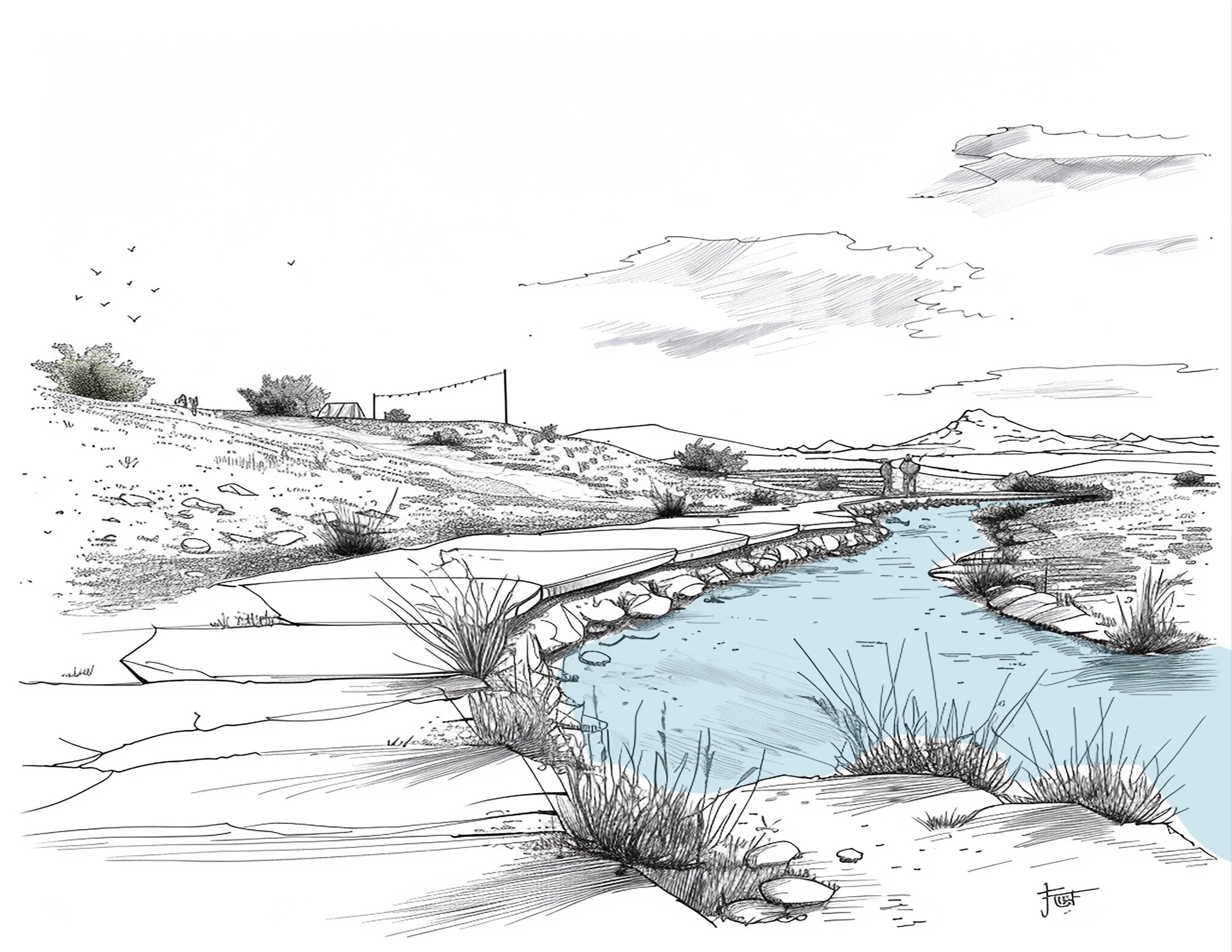 When envisioning a campground that serves as a sanctuary for contemplation amidst the Hanford high desert landscape, the transformation of the terrain from a flat spread to one with character and form is integral. This will include the creation of mounds and earth berms of varying scales and shapes, strategically and aesthetically positioned. The soil required for these landforms can be sourced primarily from the channel dug out for the re-routing of the stream, minimizing environmental impact while sculpting the landscape. Trees play a pivotal role in this transformation, carefully selected to survive in the high desert environment and purposefully placed to provide a break from the winds blowing in off the Columbia River, enhance the aesthetic appeal, and contribute to the reflective ambiance of the campground.