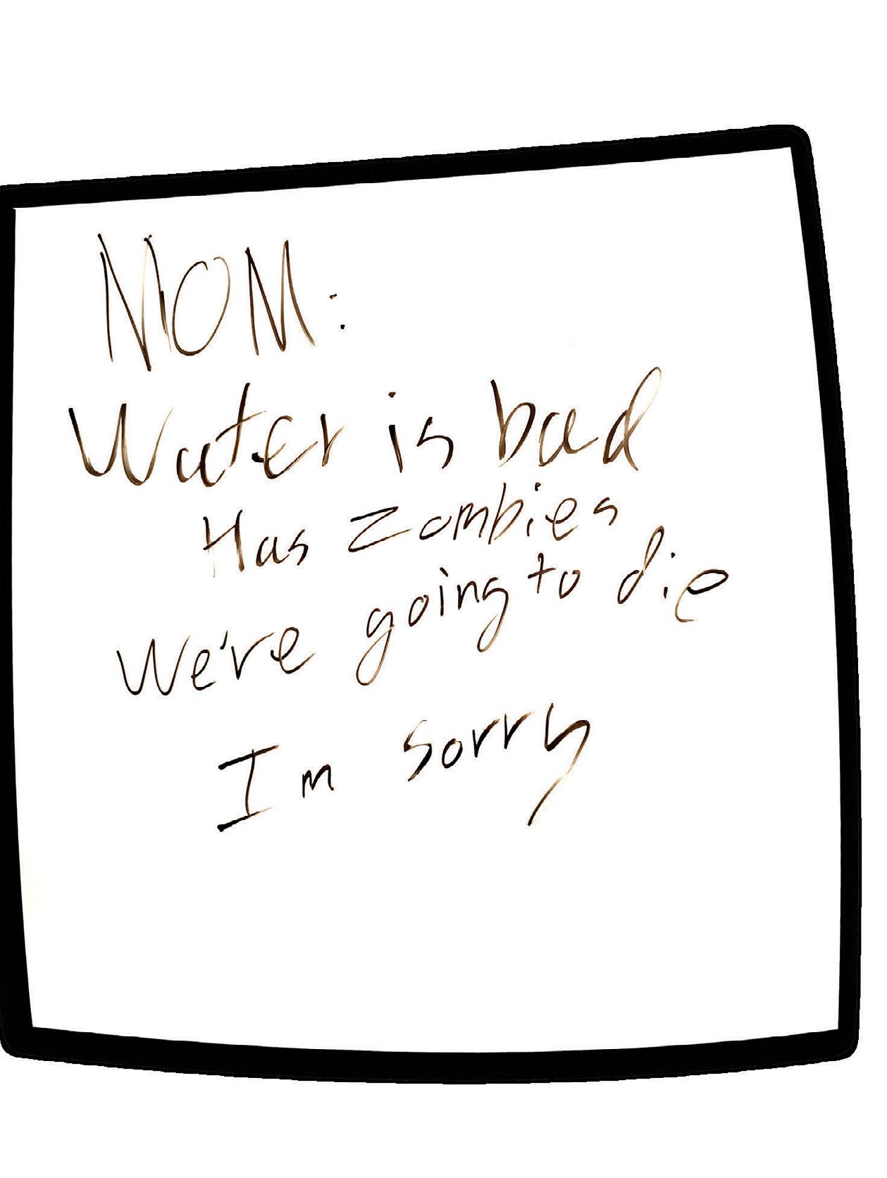 hallway similar to the one before. Water crept to Kata’s feet as the door reached its apex. Holes randomly lined each wooden panel. Doors were fragmented, cut, and resembled a mountain silhouette. Pulling out her flashlight, she marched down the hall peering through the first door on her right. Bodies linked together on the floor submerged in an inch of water. Flesh and clothes melded together on some, others were bloated from the water.