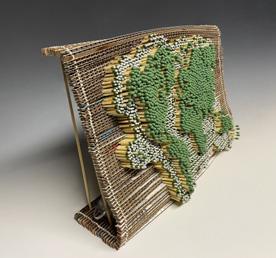 This piece portrays a map of the Earth, both land and sea, illustrated by wooden matches of two sizes. The matches represent the delicate balance between humans and the destruction happening to the earth, and the anticipation that things can go awry at any time. String lights have also been used to show the brightest areas on Earth at night – the most populated regions. The corrugated cardboard was primarily used to hold the matches in place, but was cut down into quarter-inch strips from protein shake boxes – one thing that I consume on a daily basis, and a reminder to be aware of my contribution and/or actions towards the wastefulness our species produces.