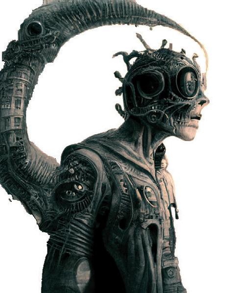 The Automaton’s head is at a side profile, designed from industrial grade tec hnology. The machine scans, projecting a beam of light outwards into the night. The silicone face has technological details, such as LEDs. A cluster of light bulbs shine with a sharp light on the back of the mechanical head. Several tubes flow down from under the jaw.