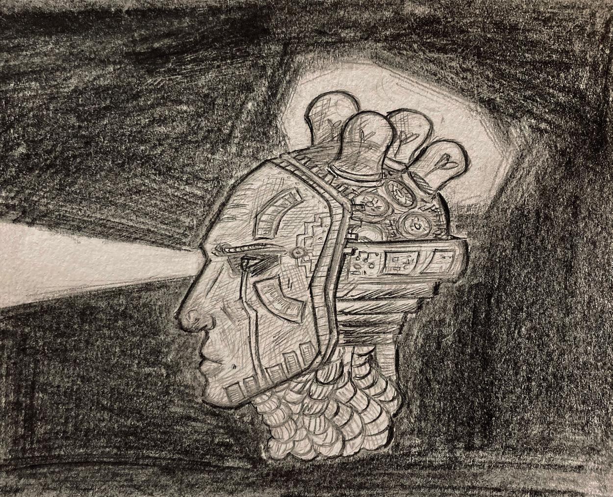 The Automaton is a drawing I made when practicing the loomis method on a 5.5 inch by 8.5 inch piece of paper, exploring a design I made for a possible android concept. Graphite pencils are the medium. First, I drew circles and lines to outline the head with a 2H and H Graphite pencil, adding details and refining as I went, blocking out the shapes. With a B pencil, I added line weight to make the shapes pop as well as adding value and with a 2B pencil I added shadows in the background, which also added a grainy texture.