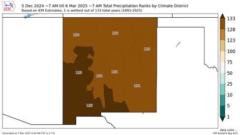 What does that map mean? Well, it means that out of 133 years of data, the areas that have a 133 on them have never seen a drier December - February Even far east/northeast New Mexico that did receive better moisture have only had 4 drier December - February periods in that 133 year period Basically, it’s been bad and the wind that we’ve had lately is only adding insult to injury with blowing dirt and fire danger But, we’ve all seen this movie before