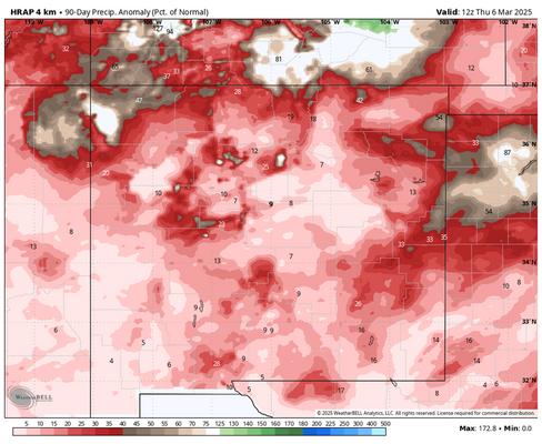 The above map shows the precipitation anomaly from December 6th through March 6th Much of New Mexico has seen less than 15% of average precipitation Some areas of New Mexico has seen less than 10% of average precipitation. Here is a look at the total liquid (rain/melted snow/ice) we’ve seen during that time