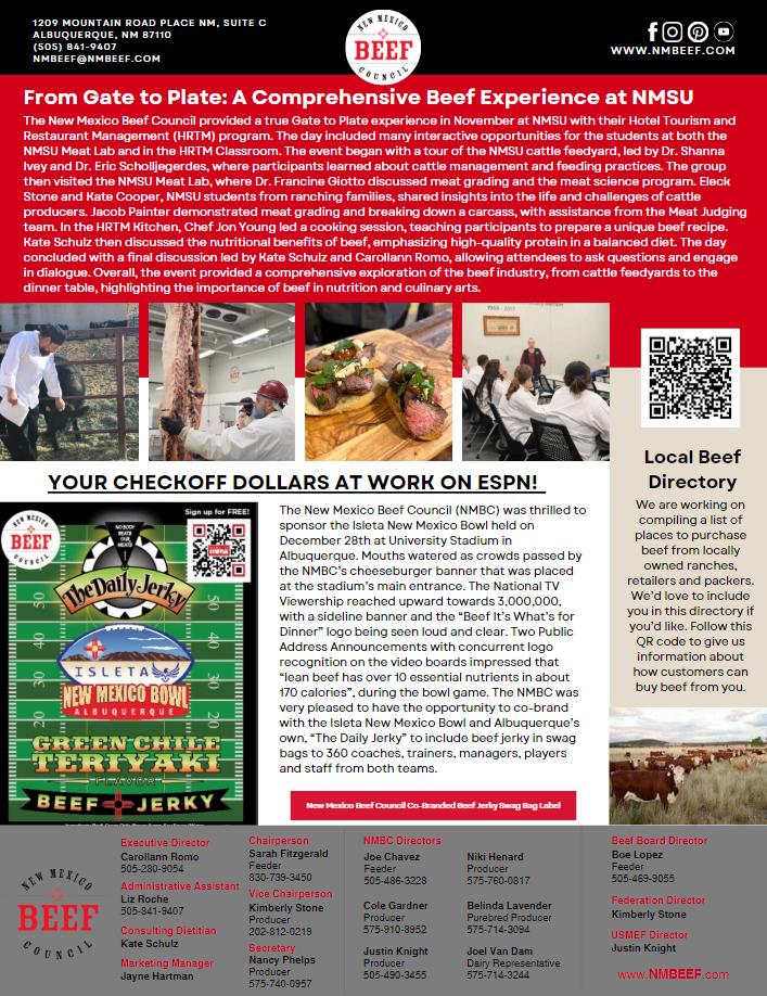 Hopefulness that working together we can make things happen You saw one example of this during Joint Stockmen’s when we asked the Livestock Board to start charging the NM Beef Checkoff on all cattle entering at Santa Teresa from Mexico If this goes through, the Beef Council will be positioned to use those funds to do even more meaningful work on things that affect us at the ranch level, things such as enhanced biosecurity at our border.